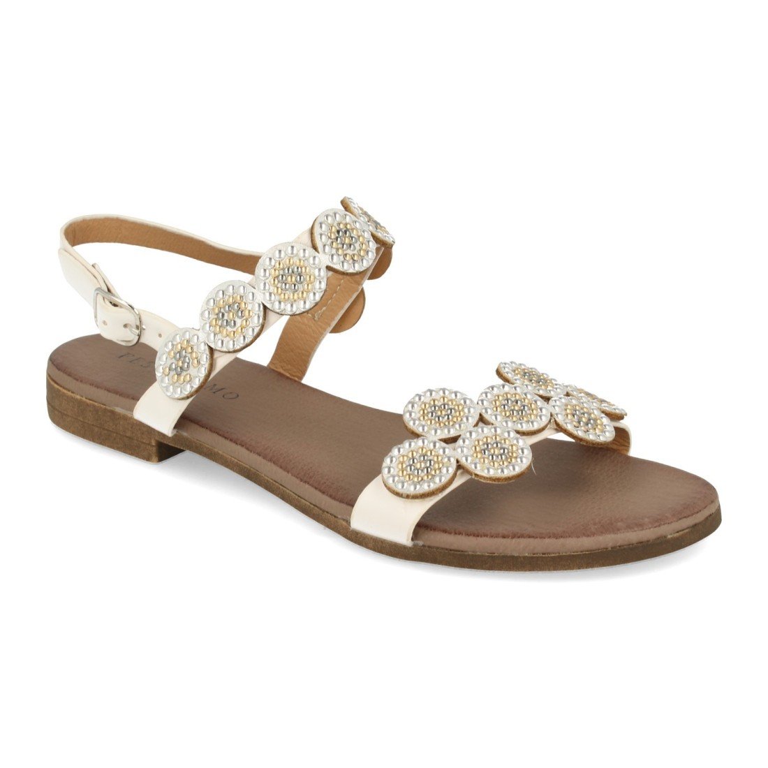 Sandalia Plana con Adornos Metalizados y Cristalizados, Cierre de Hebilla Primavera Verano 2020