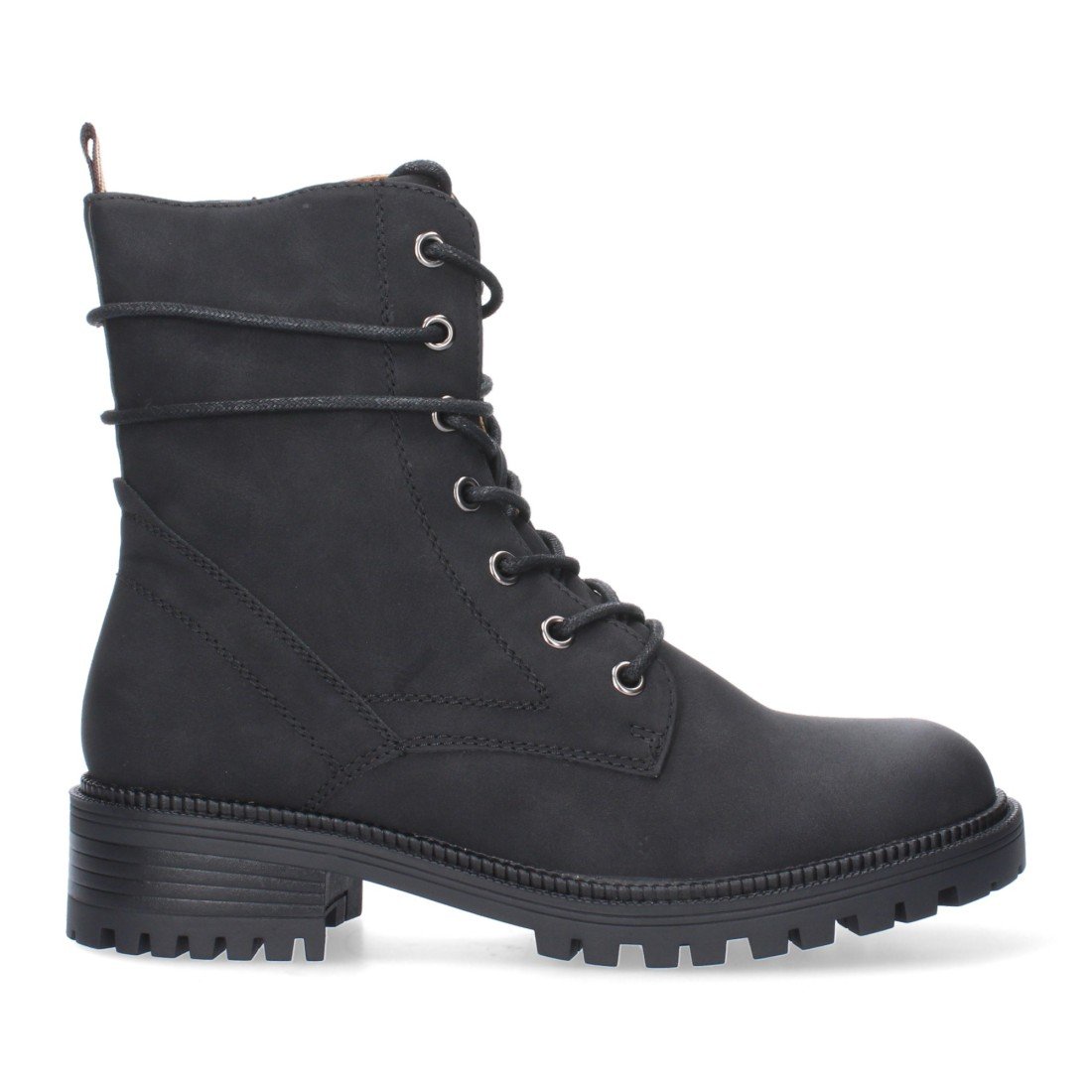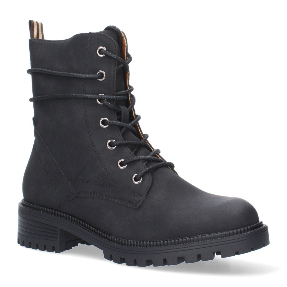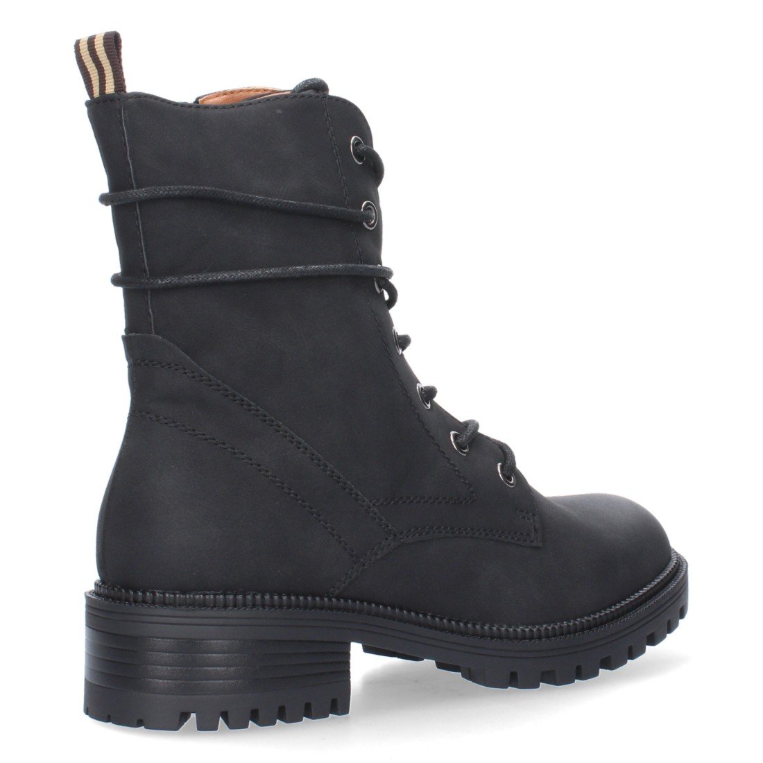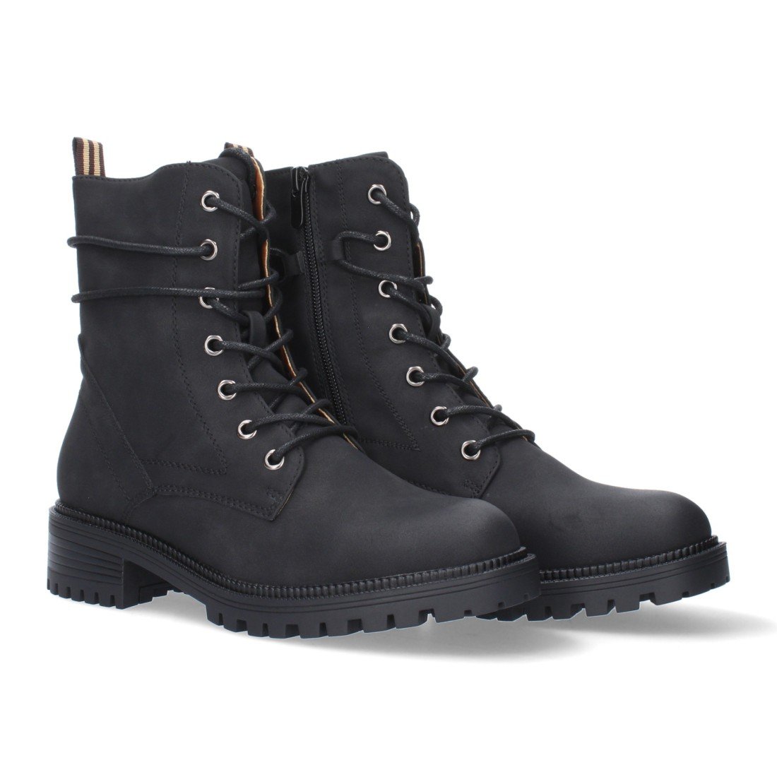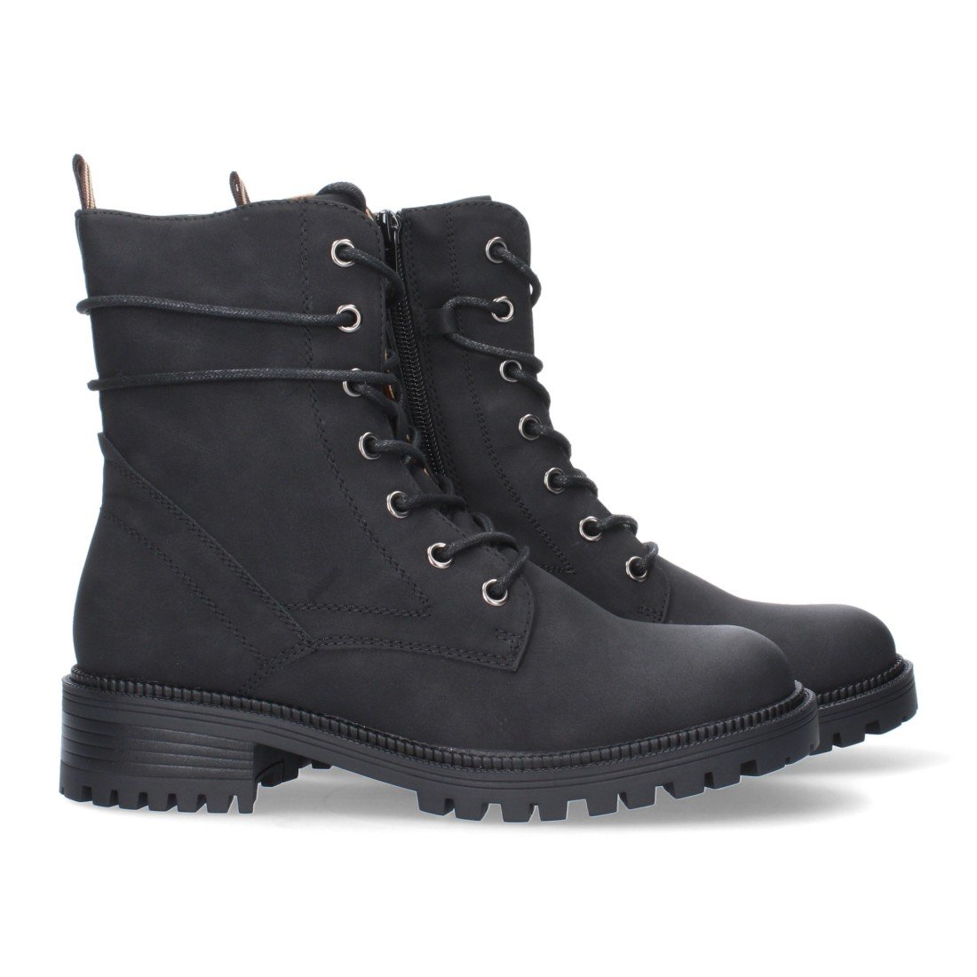 Botín de tacón para mujer, cierre de cremallera y de cordones, con adorno en la caña.
