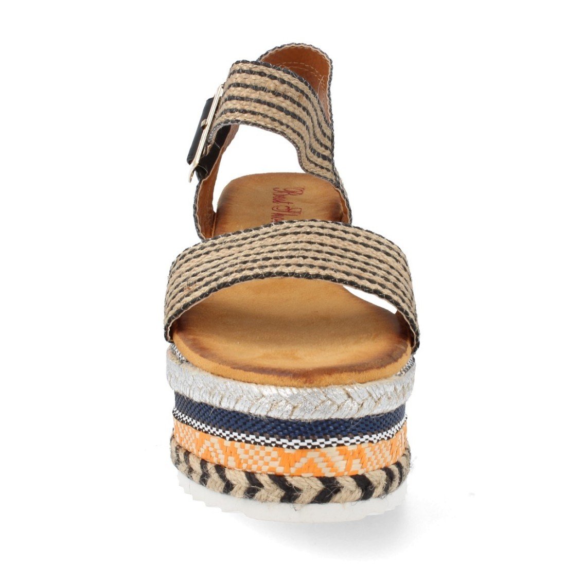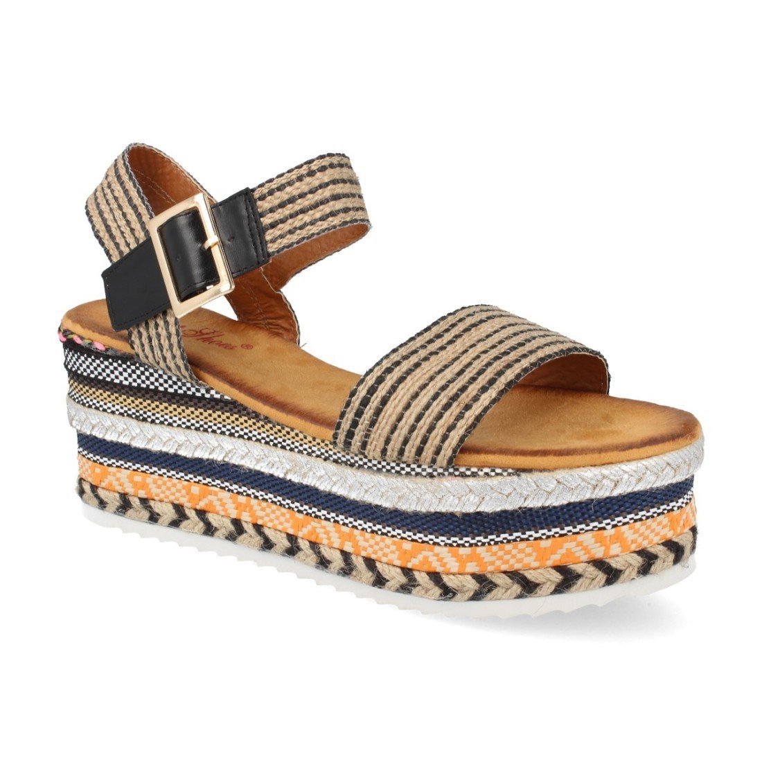 Sandalia con plataforma de yute con trenzados geométricos multicolor,pala simple y cierre de hebilla en el tobillo.