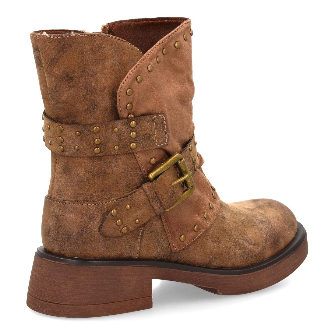 Bota de mujer estilo biker, temporada Otoño Invierno. Tachuelas metalicas y doble correa con hebilla ajustable.