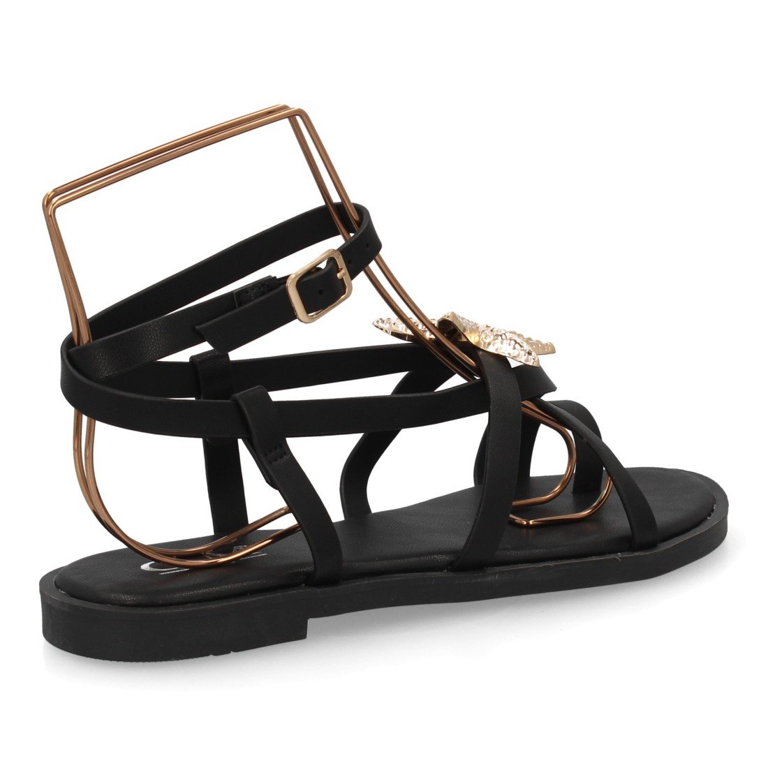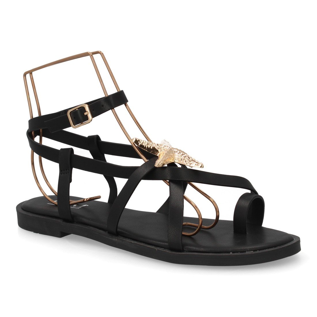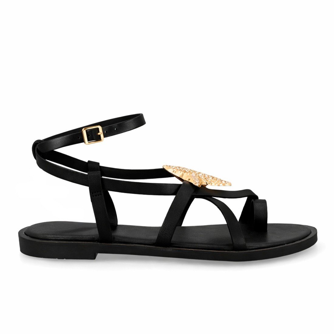 Sandalia plana romana diseño de estrella de mar en empenie. Detalle metálico, cierre de hebilla, estructura de tiras finas y planta acolchada, ideal para mujer primavera verano