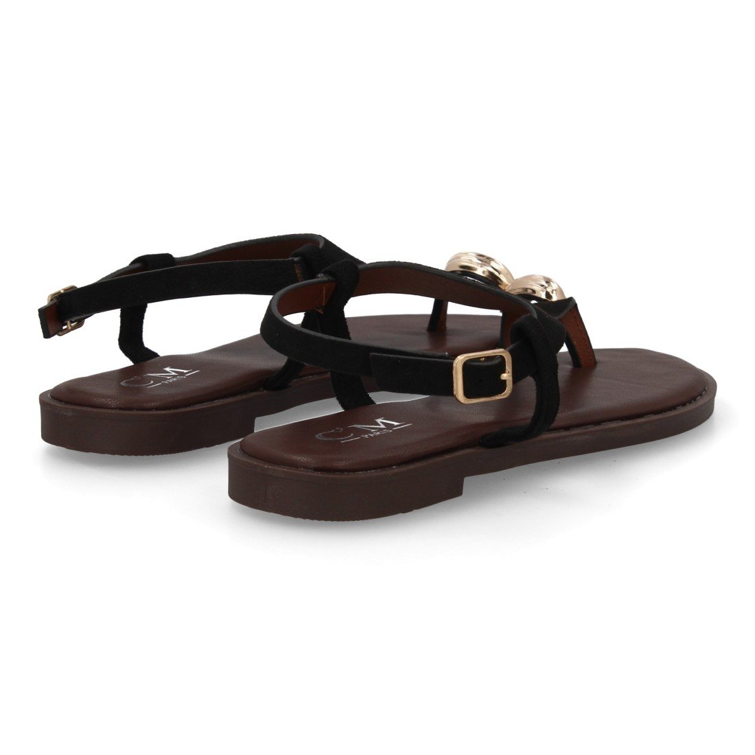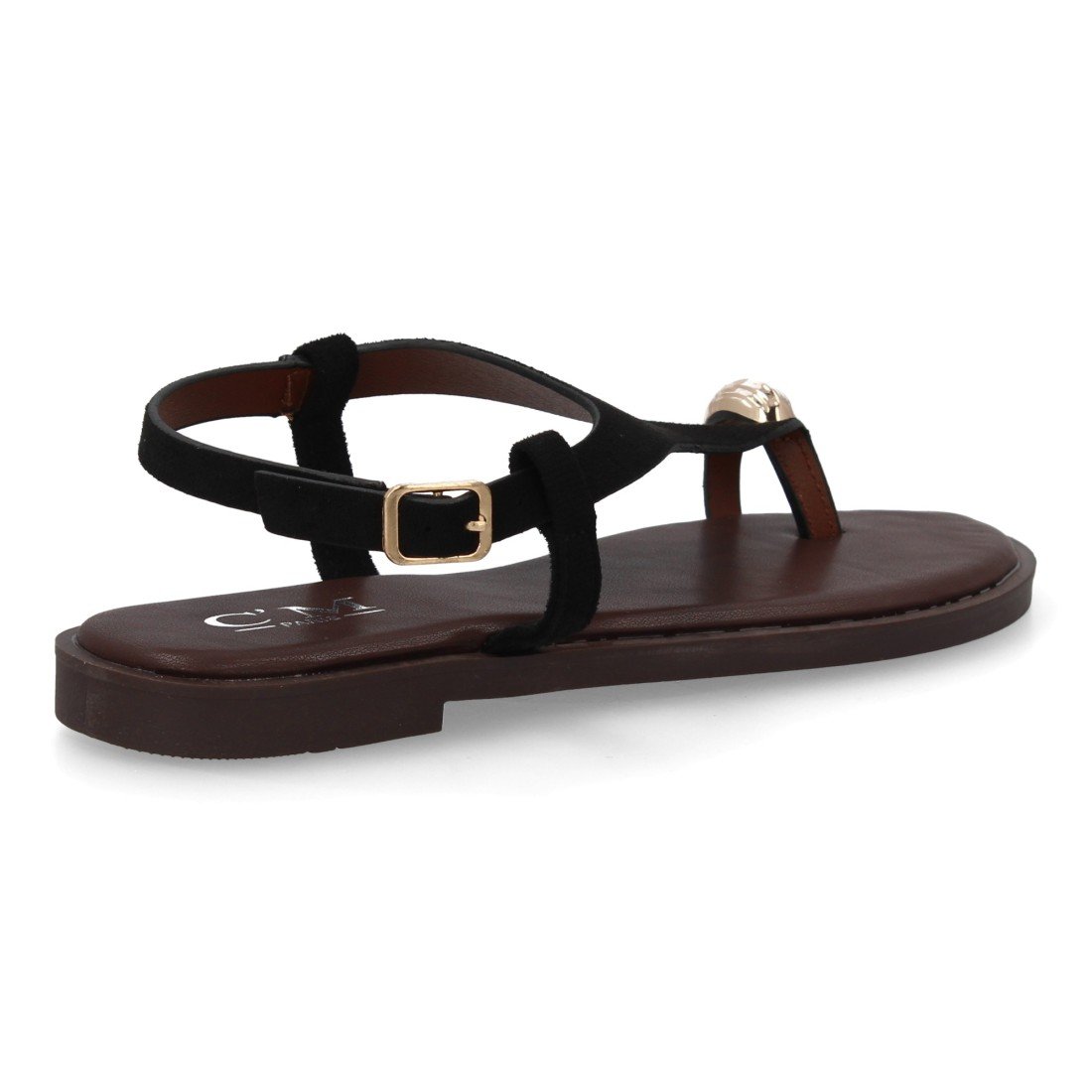 Sandalia plana de mujer con diseño elegante y minimalista, tira ancha que tapa el empeine. Adorno metálico. Muy cómodo. Cierre al tobillo con hebilla. Ideal Verano.