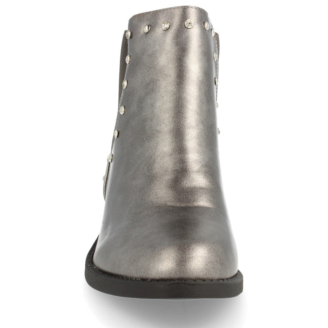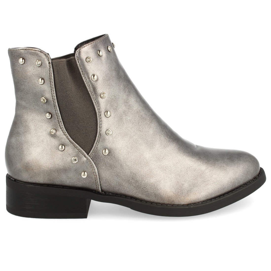 Botín plano de punta redonda con elásticos y tachas en los laterales. Altura: 3 cm.