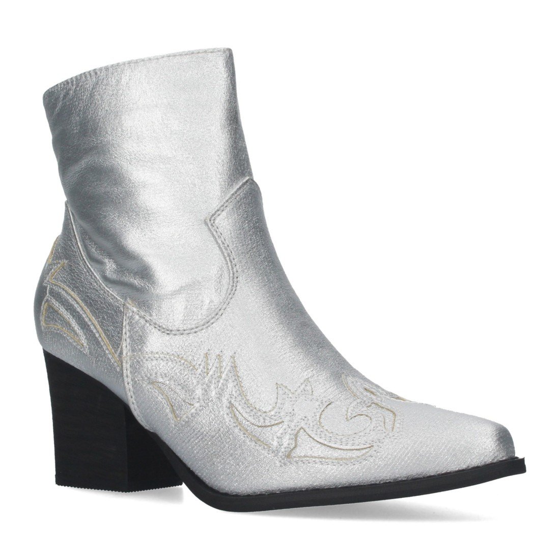 Botines camperos para mujer de tacon medio con adorno estilo cowboy en la puntera y en el talon y cierre de cremallera.