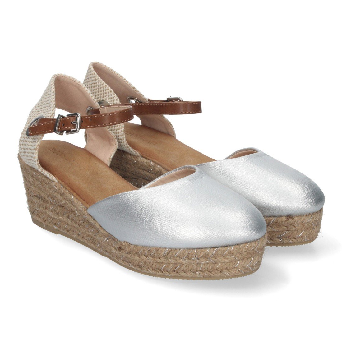 Sandalia de Cuña de Yute para Mujer, Cómodas y Elegantes, Pala Cerrada, Yute con Adornos Brillantes y Cierre de Hebilla Ajustable.
