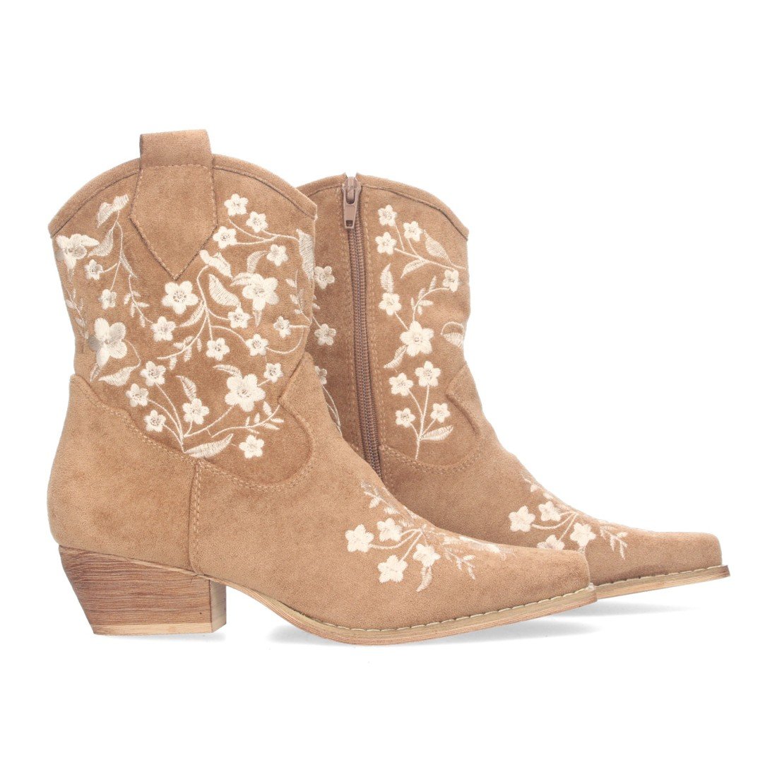 Botín campero de tacón bajo con diseño de flores en la caña y el empeine con cierre de cremallera.