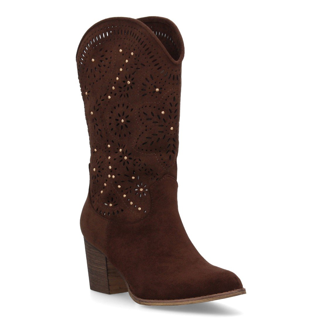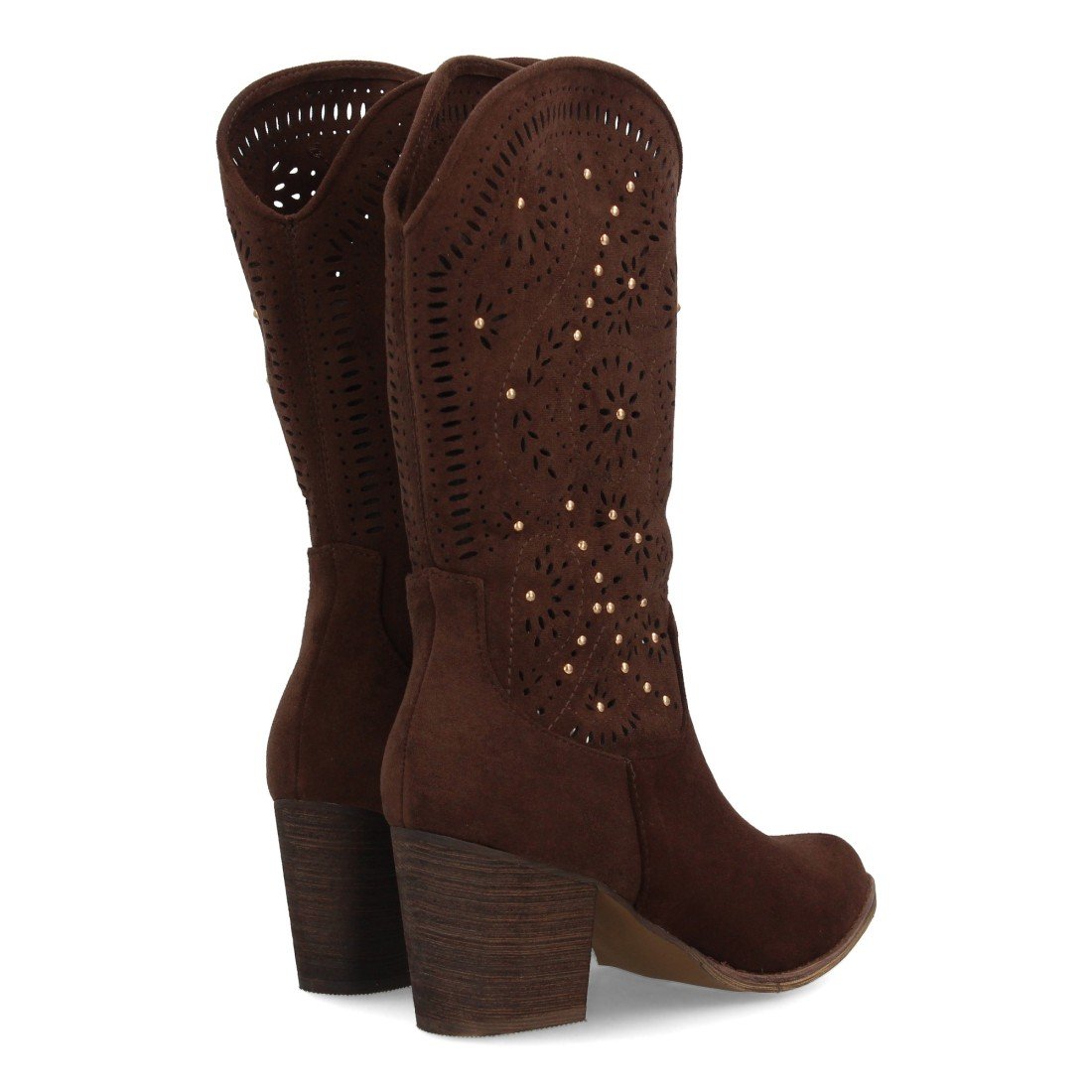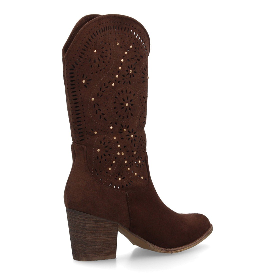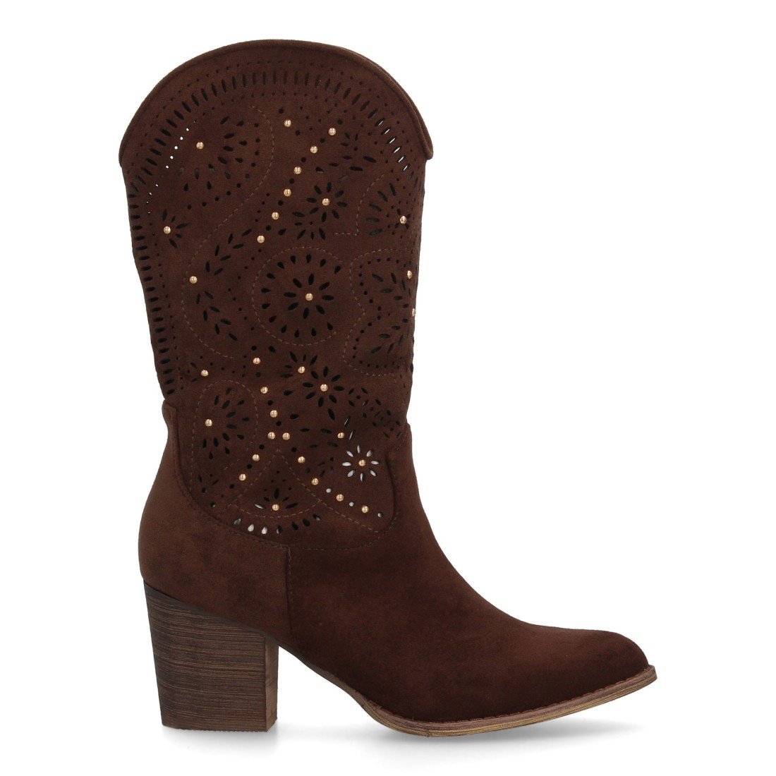 Botas estilo cowboy para mujer, elegante diseño troquelado con motivos florales y pequeños apliques metálicos. Tacón ancho y cómodo. Cierre de cremallera ideal entretiempo.
