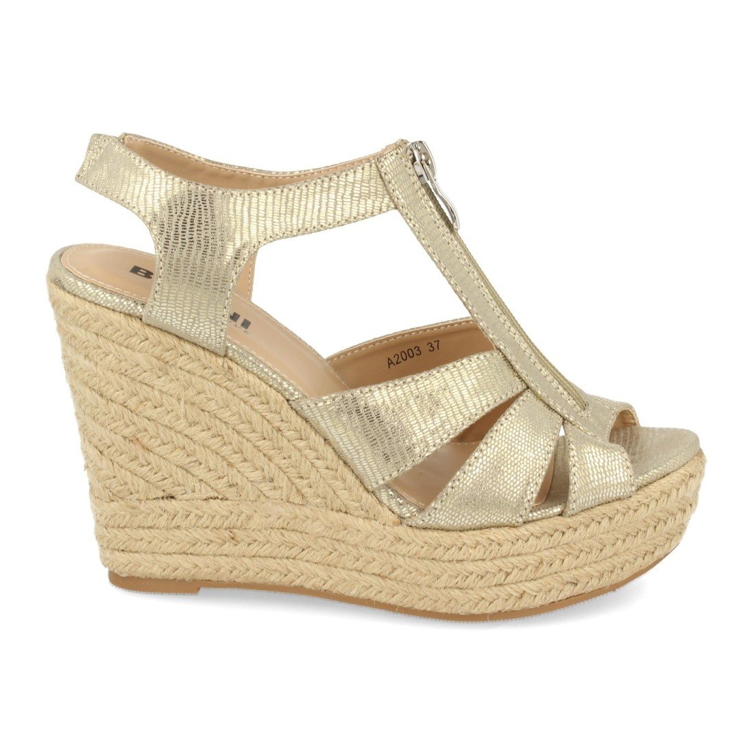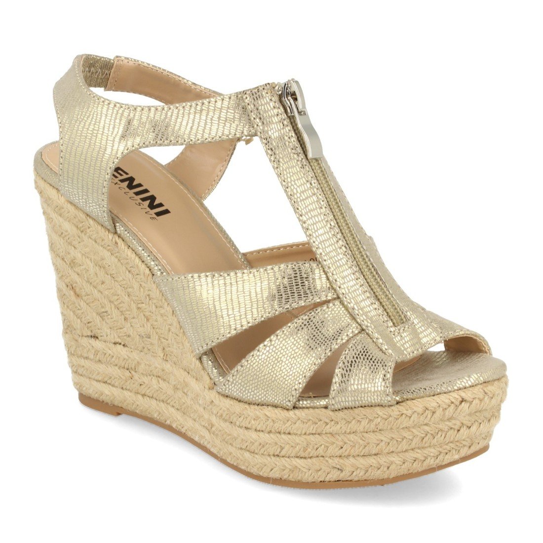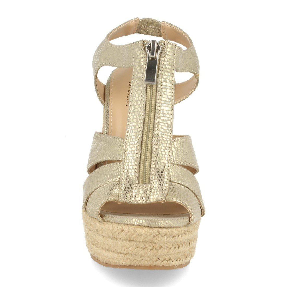Sandalia con cuña de yute, correa T y cierre de cremallera en el empeine.