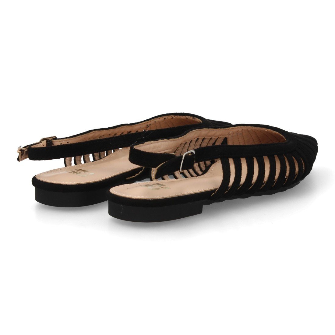 Sandalia plana tipo bailarina destalonada con diseño troquelado para mujer. Punta fina y laterales abiertos, ideal primavera verano. Cierre de hebilla. Ideal para uso diario.