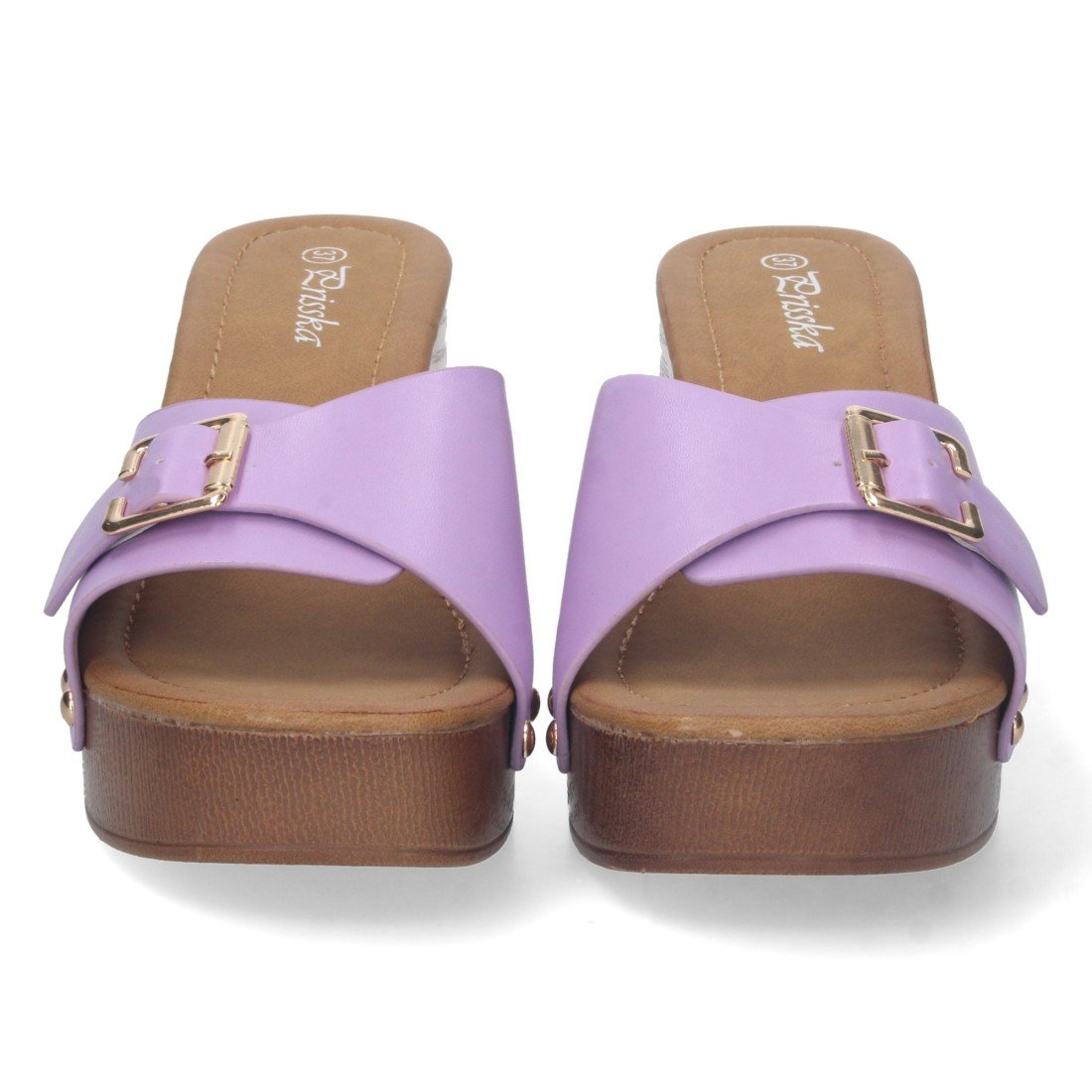 Zueco de Tacon Alto para Mujer, Comodo, Material de Imitacion a Madera, con Talon Abierto, Pala con Hebilla y Remaches