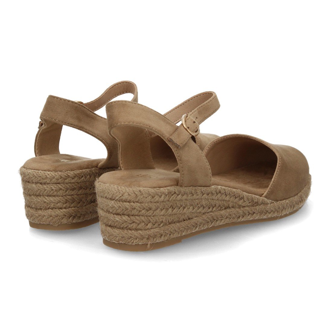 Sandalia Alpargata de mujer con cuña de esparto y puntera cerrada, talón abierto con cierre de hebilla. Cuña baja con plataforma ligera ideal para uso diario en primavera verano