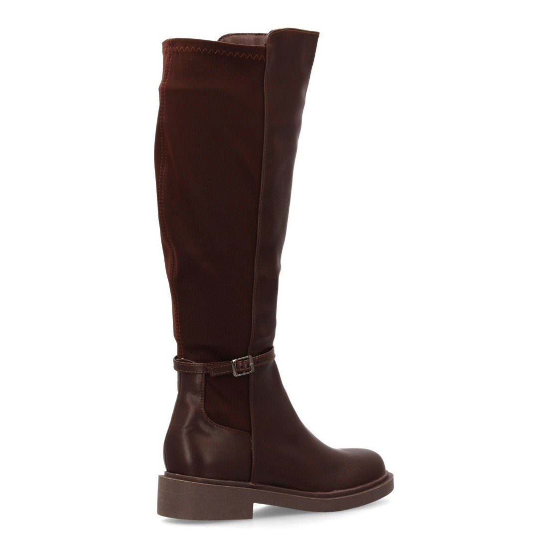 Bota alta para mujer con caña combinada en material sintético y tejido elástico. Su diseño tipo ecuestre incorpora una hebilla decorativa en el tobillo y suela plana con tacón bajo para el día a día