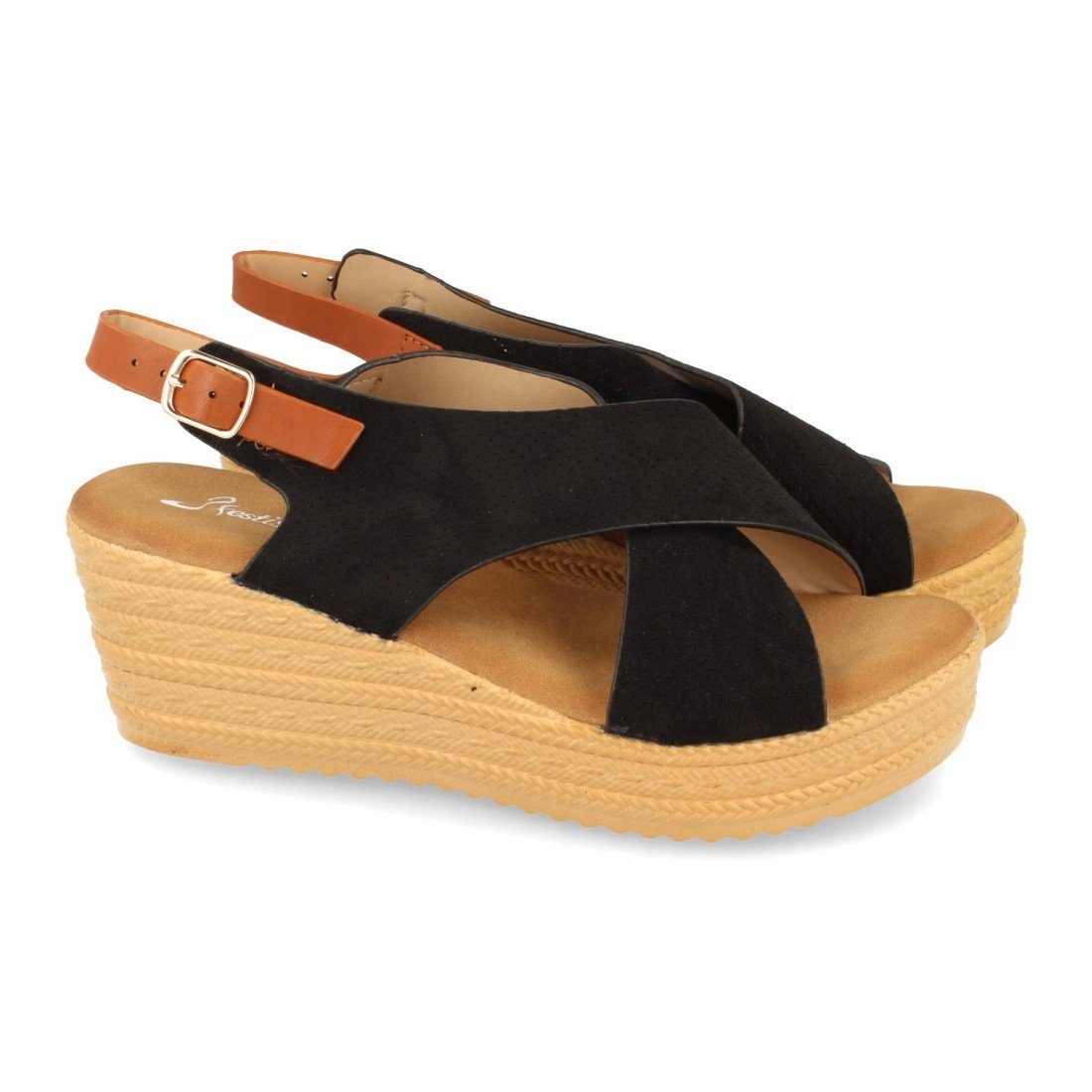 Sandalia de Cuña para Mujer, con Doble Pala Cruzada, Perforado Mil Puntos, Talon Abierto y Cierre de Hebilla Primevera Verano 2020
