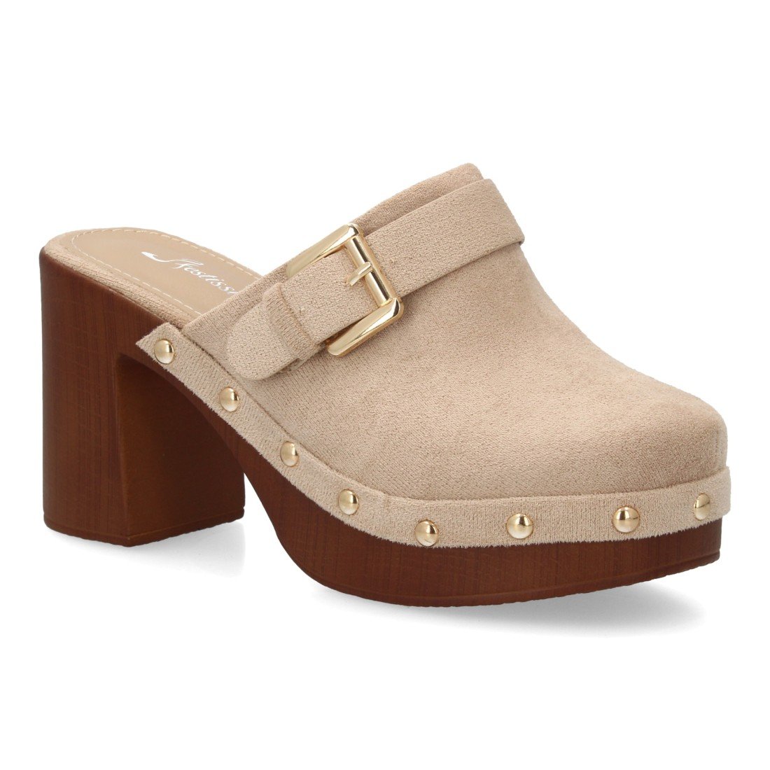 Zueco de tacón ancho con plataforma, diseño tipo sueco para mujer. Estilo artesanal, suela de madera sintética, punta cerrada tachuelas metálicas y hebilla decorativa, primavera