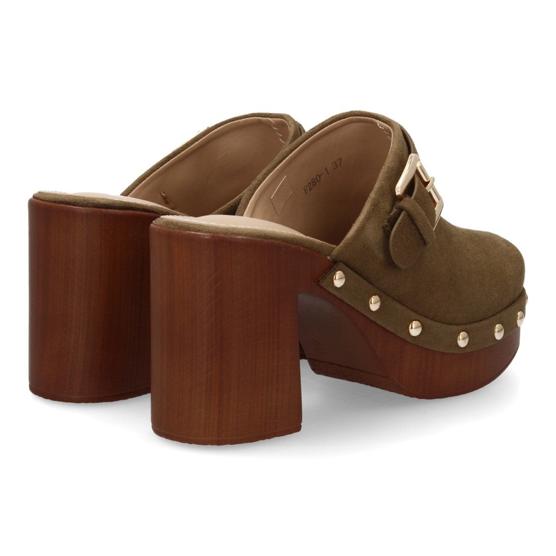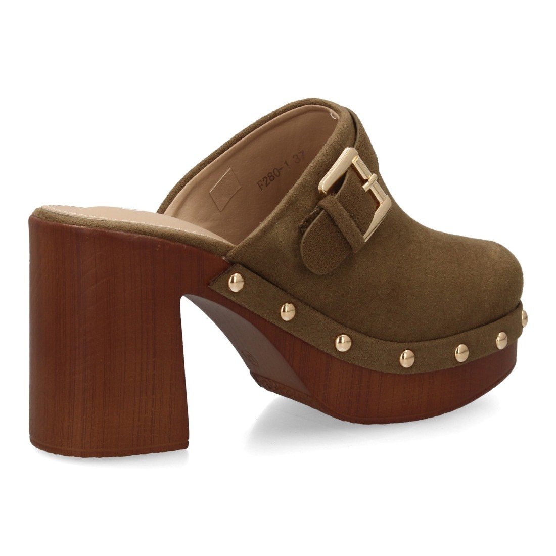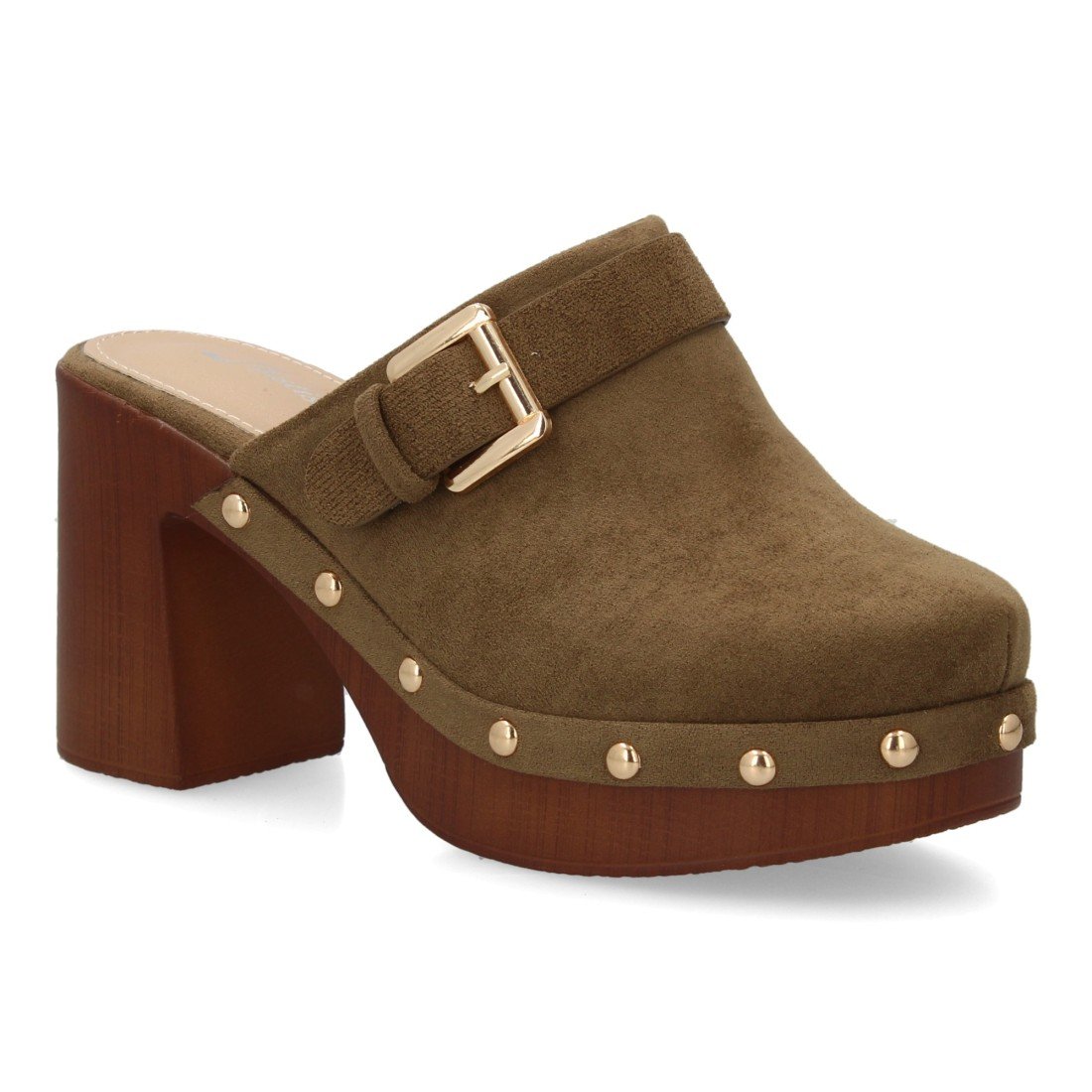 Zueco de tacón ancho con plataforma, diseño tipo sueco para mujer. Estilo artesanal, suela de madera sintética, punta cerrada tachuelas metálicas y hebilla decorativa, primavera