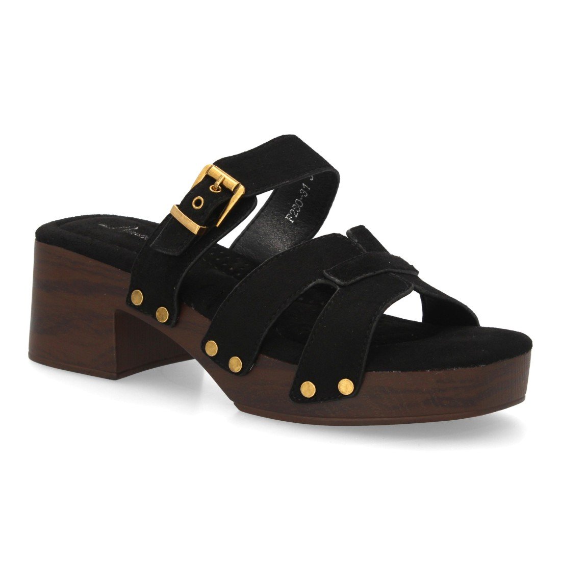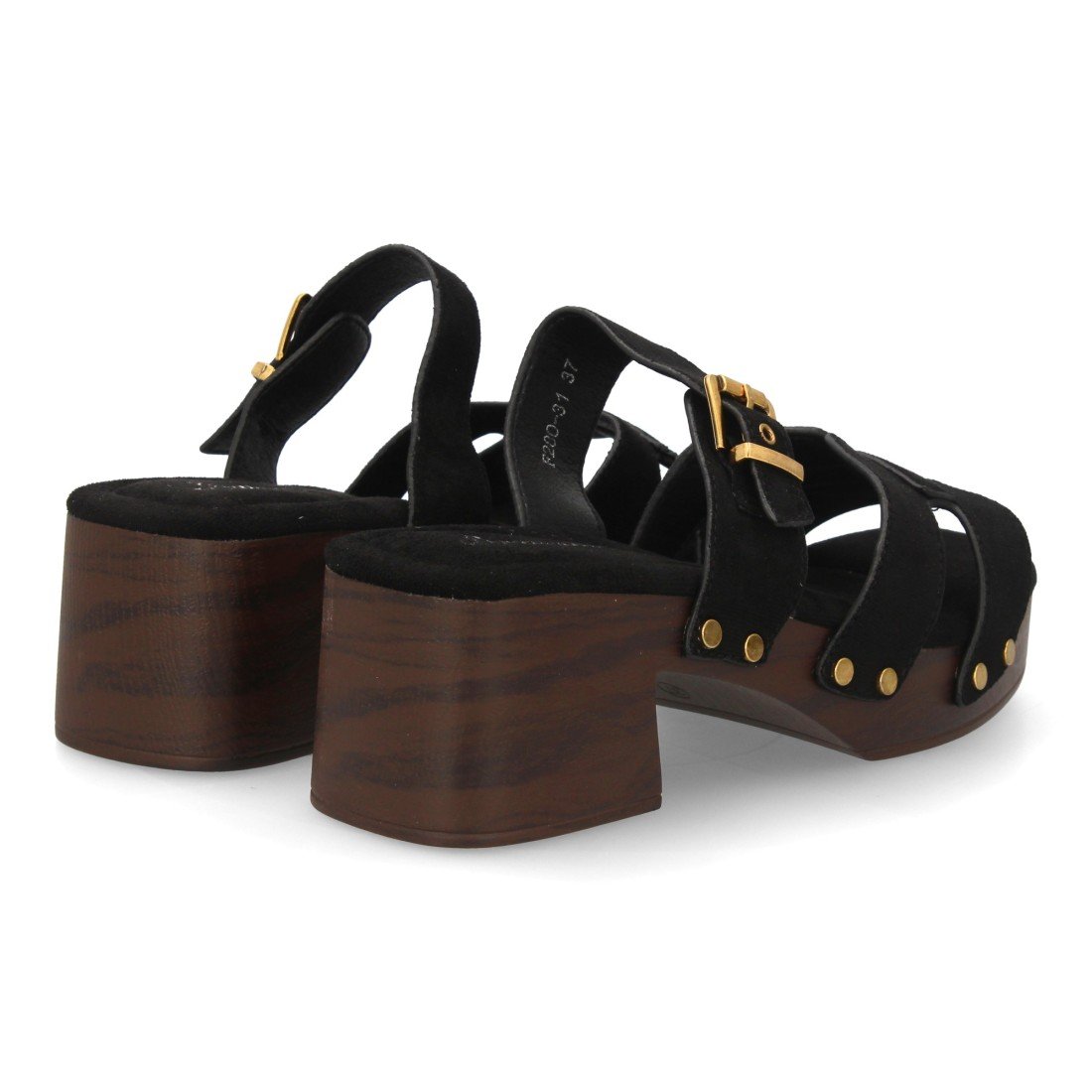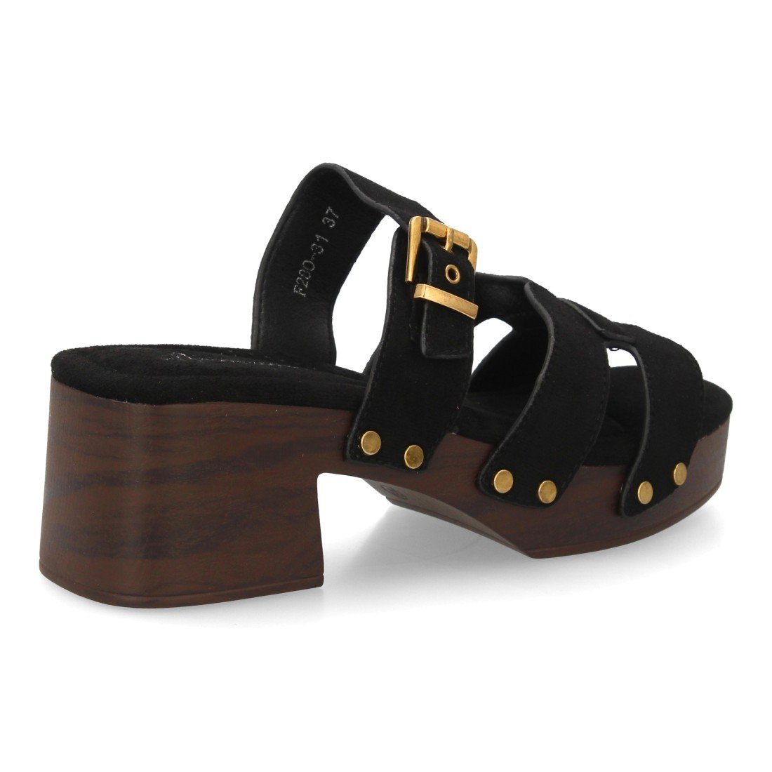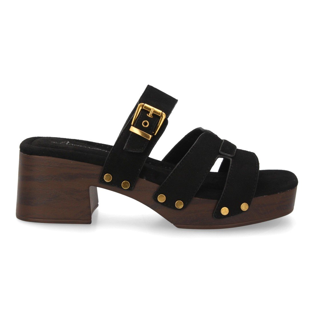 Sandalia para mujer con tachuelas y suela estilo madera, diseño de varias tiras en el empeine, cierre de hebilla. Un modelo cómodo y ligero para primavera verano.