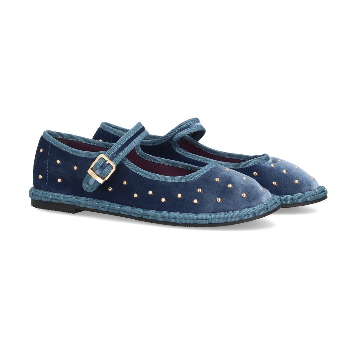 Bailarinas planas para mujer, diseño de apliques metálicos en toda la superfie, hecha de terciopelo con ribete en contraste, suela flexible y cierre de hebilla. Ideal entretiempo.