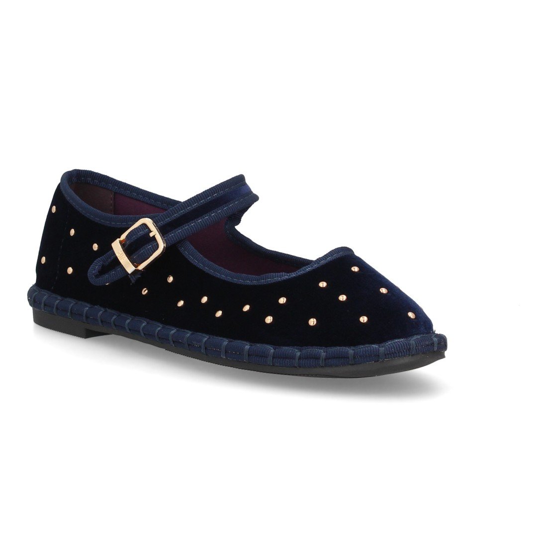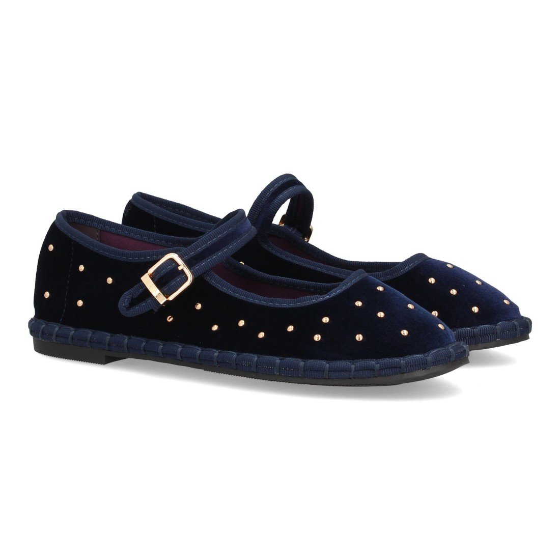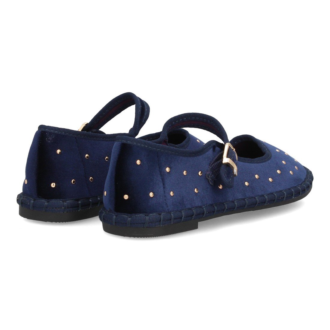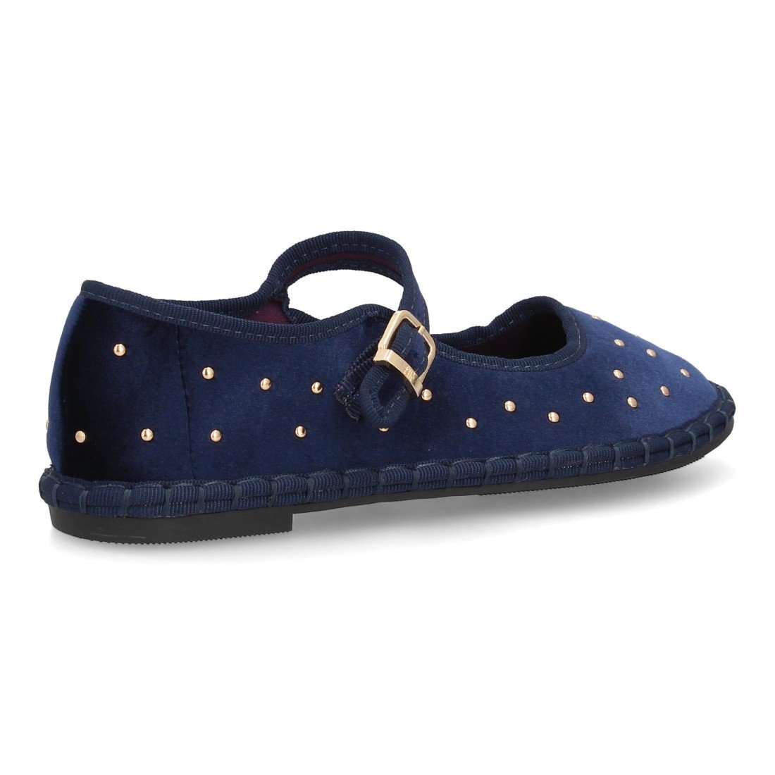 Bailarinas planas para mujer, diseño de apliques metálicos en toda la superfie, hecha de terciopelo con ribete en contraste, suela flexible y cierre de hebilla. Ideal entretiempo.