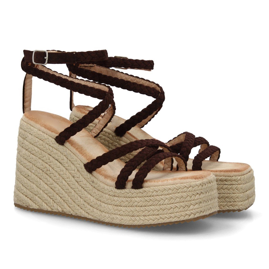 Sandalia de mujer con cuña alta y plataforma de esparto, cierre de hebilla en el tobillo. Plantilla acolchada, ligera. Perfectas para verano, eventos al aire libre o looks casuales