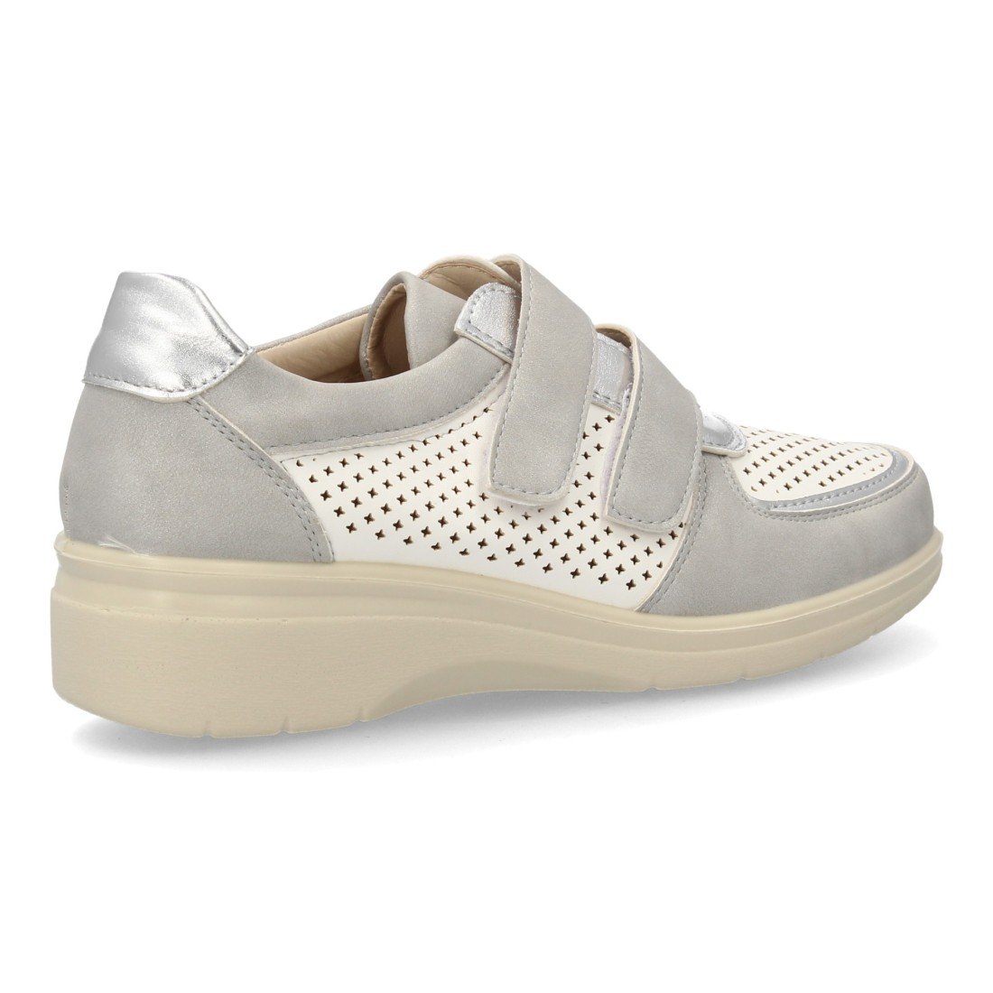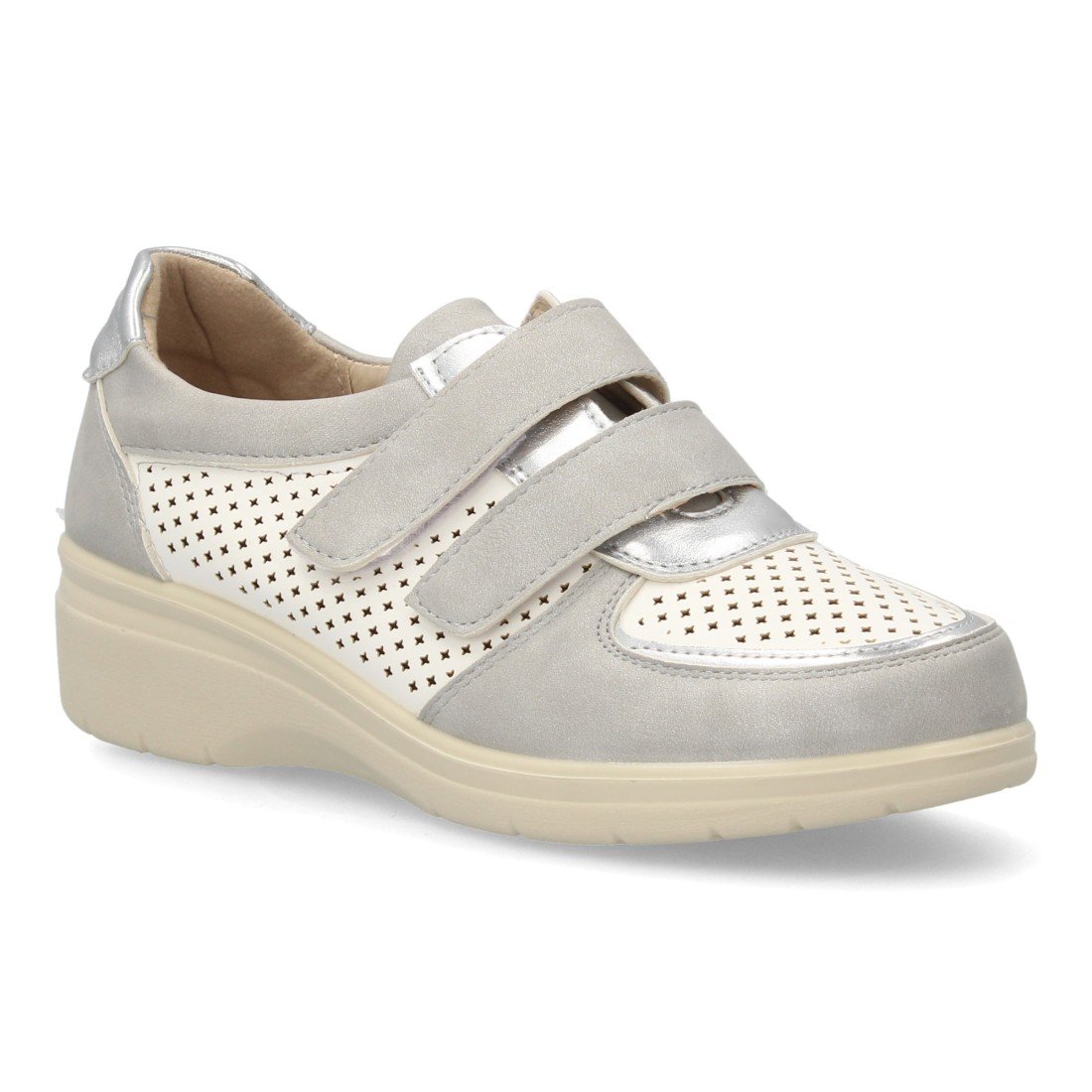Zapatillas confort para mujer, ofrecen bienestar en el día a día. Corte troquelado que favorece la transpiración, cierre autoadherente. Detalles metalizados, suela ligera con cuña.