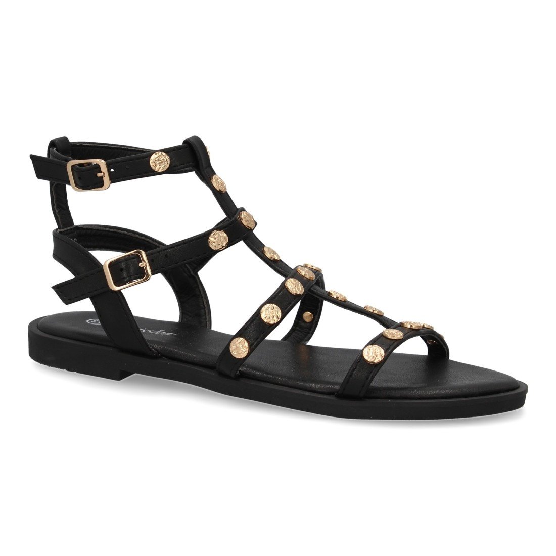 Sandalias planas de mujer, comodas y elegantes, diseño moderno con tachuelas, con cierre de hebilla ideales para primavera-verano.