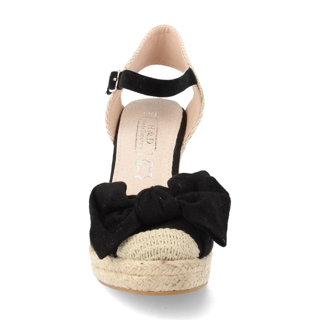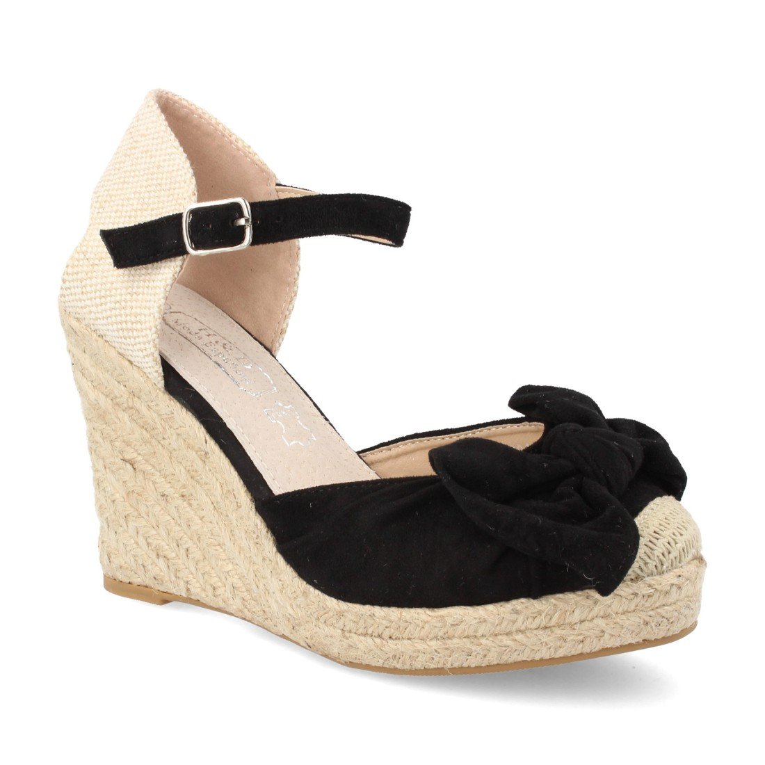 Sandalia de cuña en yute, con el talón descubierto y detalle de lazo en la punta. Planta de piel. Altura: 10 cm.