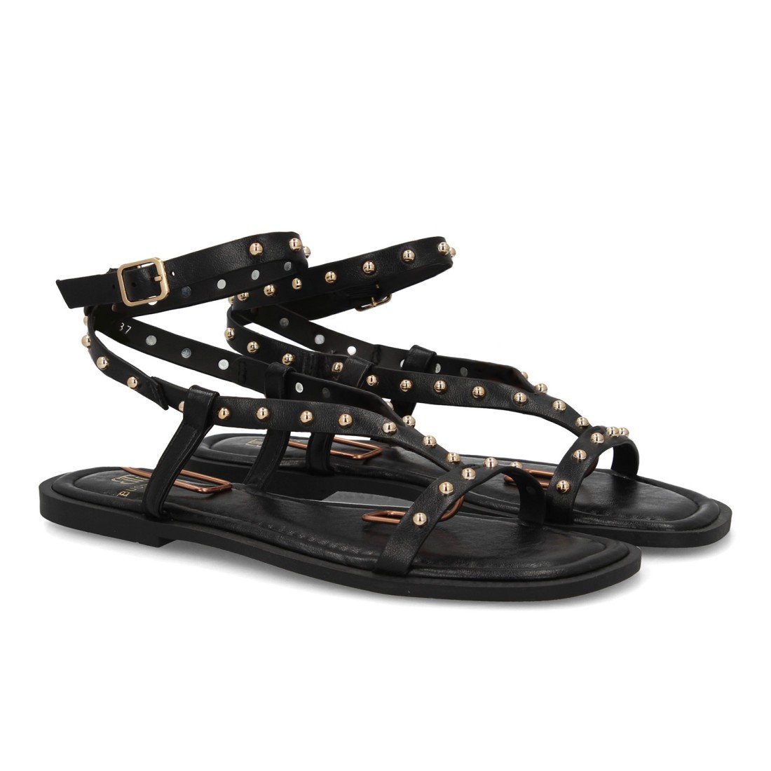 Sandalia plana mujer estilo romana diseño de tiras y detalle de tachuelas metálicas. Sujeción al tobillo y cierre de hebilla. Ideal para uso diario en primavera verano.