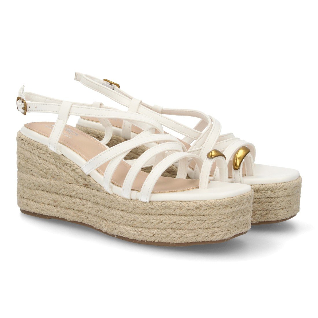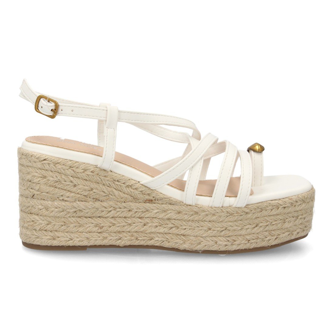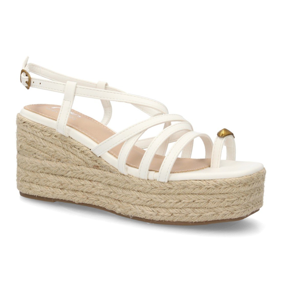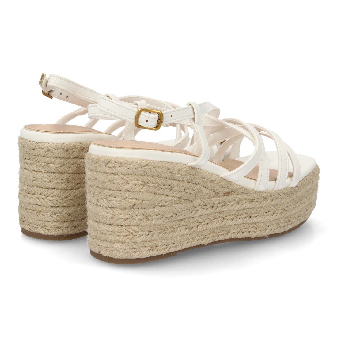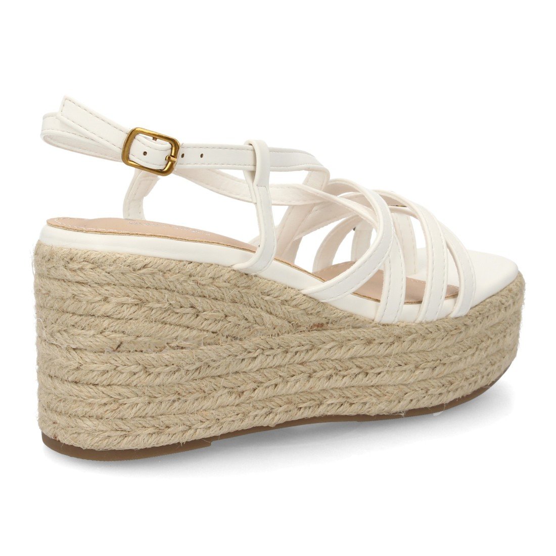 Sandalia de mujer con cuña alta de esparto y plataforma, diseño de tiras finas cruzadas y pulsera con cierre de hebilla. Detalle metálico decorativo uso diario primavera verano