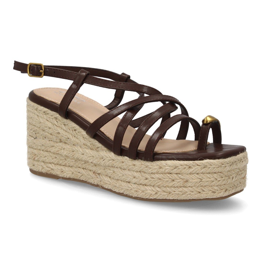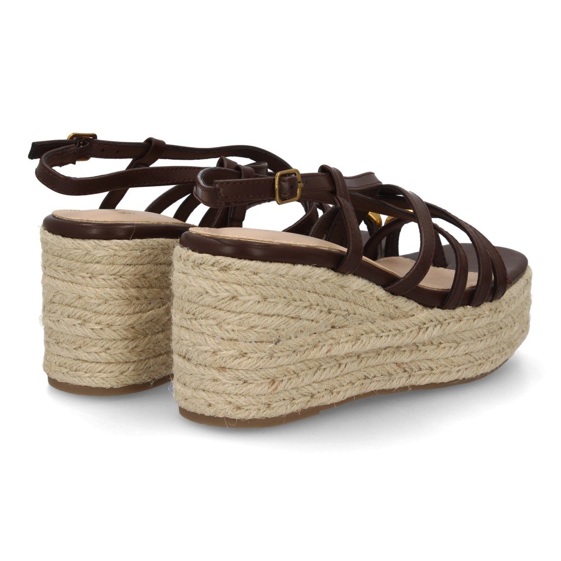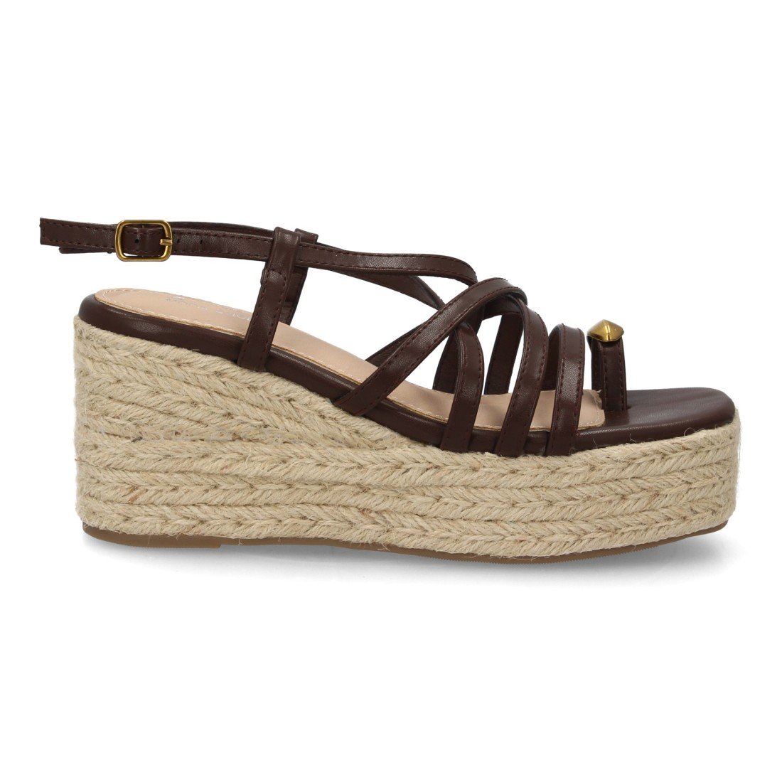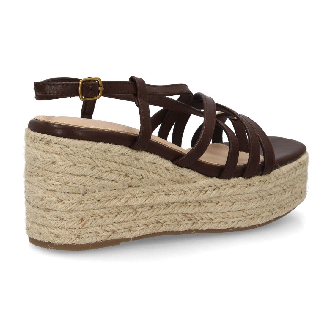 Sandalia de mujer con cuña alta de esparto y plataforma, diseño de tiras finas cruzadas y pulsera con cierre de hebilla. Detalle metálico decorativo uso diario primavera verano