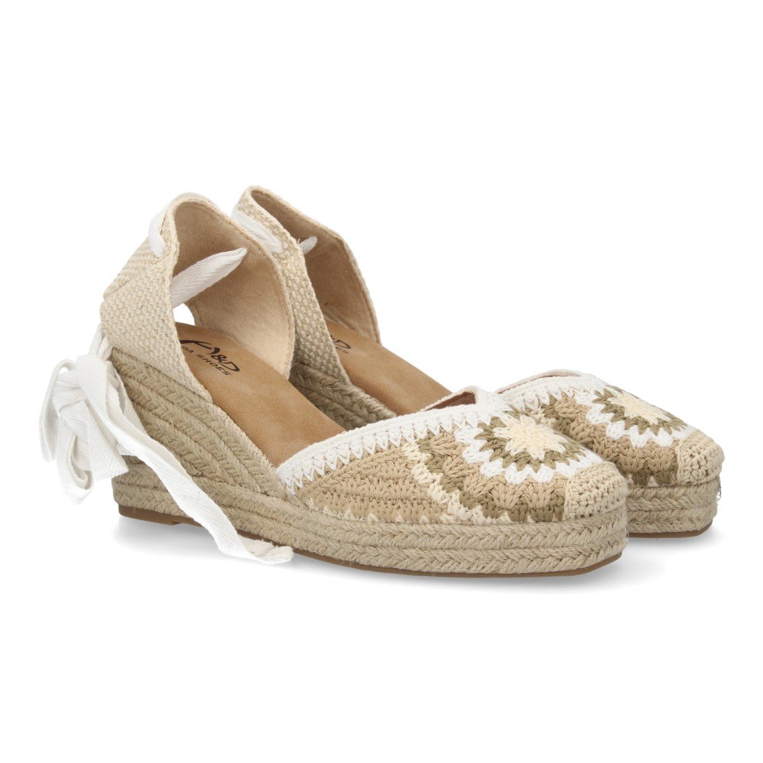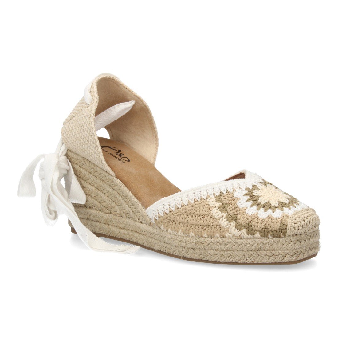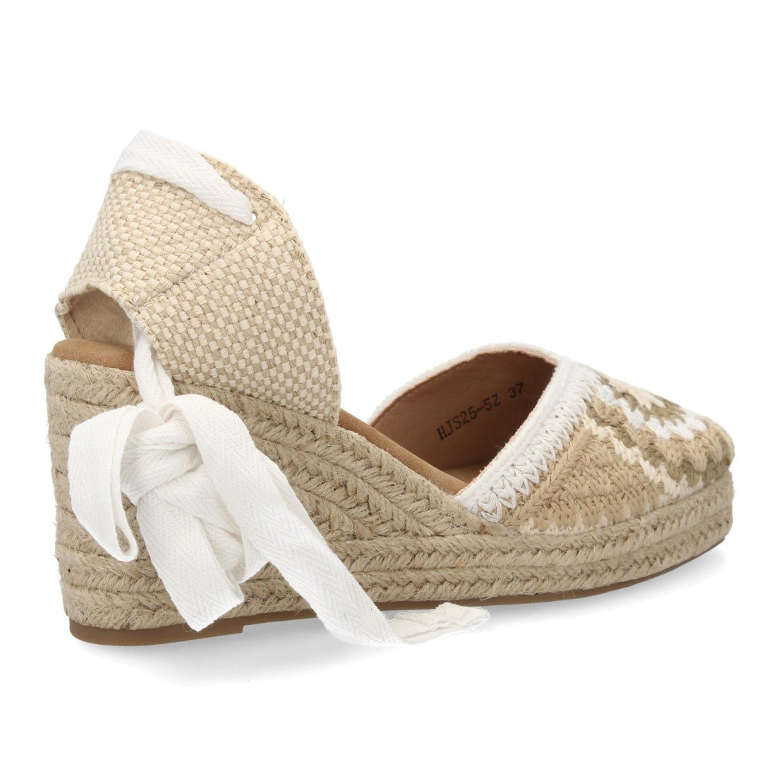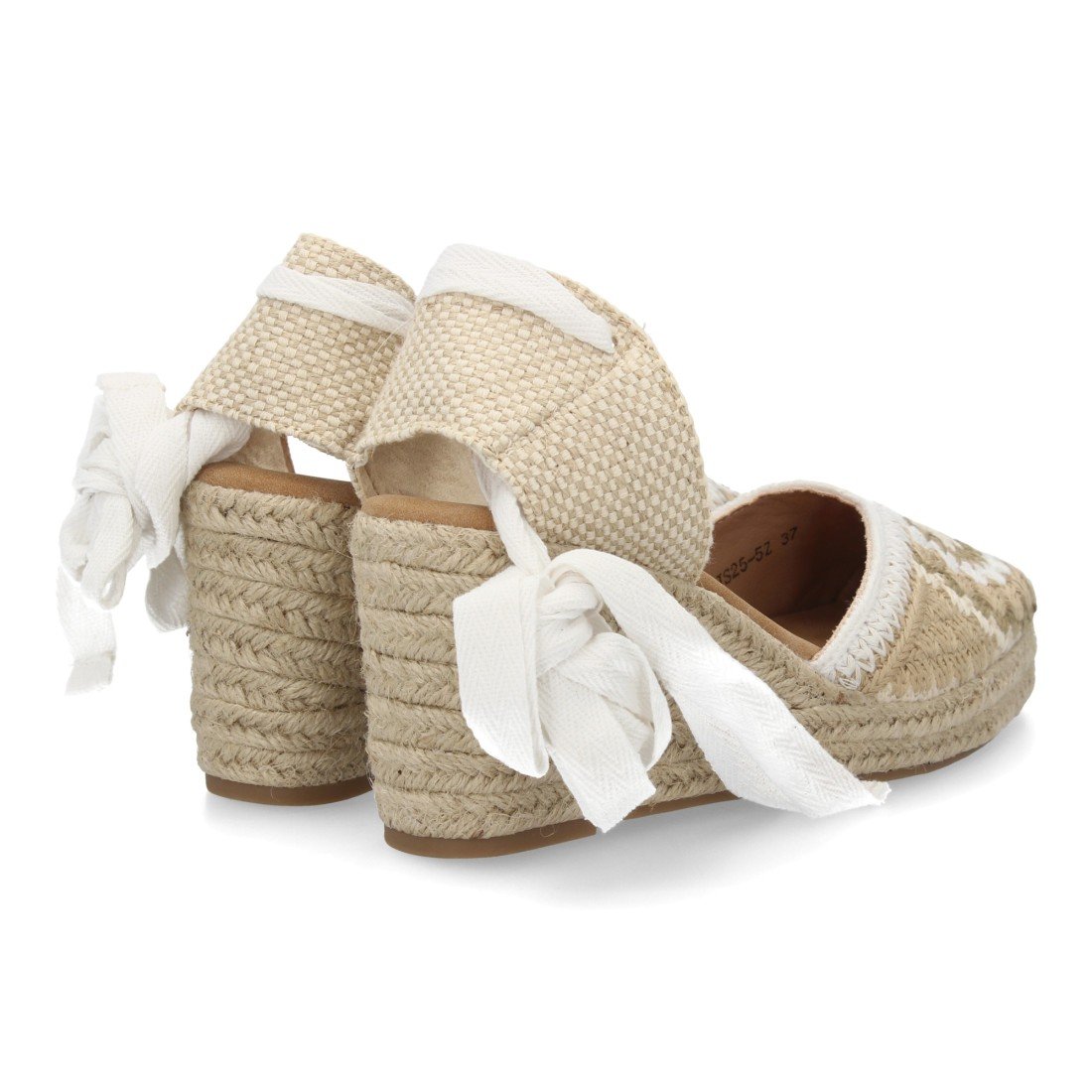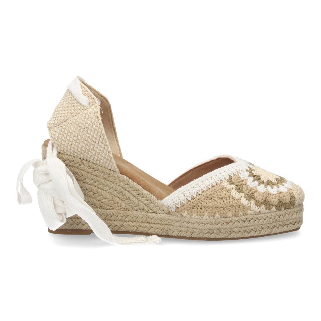 Alpargata de mujer con diseño artesanal que destaca por su tejido decorativo artesanal con cuña acolchada de esparto. Cierre de cintas. Un modelo cómodo y ligero para verano.