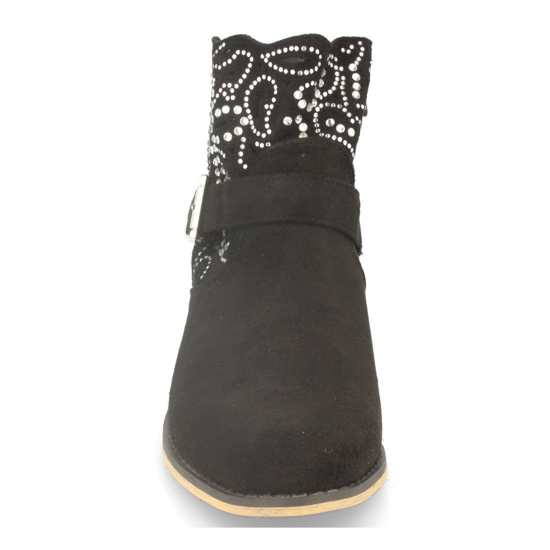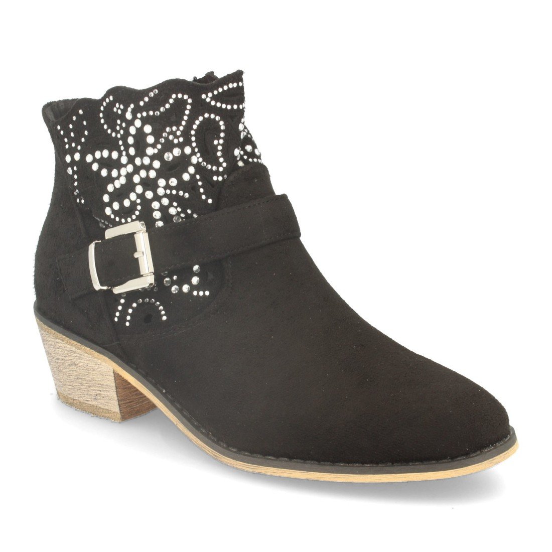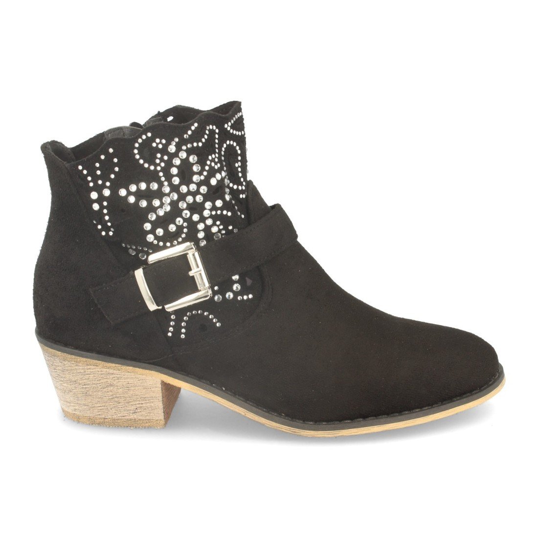 Botin de Mujer Estilo Campero, con Tacon, Hebilla y Decorado con Strass en Forma de Flor Primavera Verano 2020
