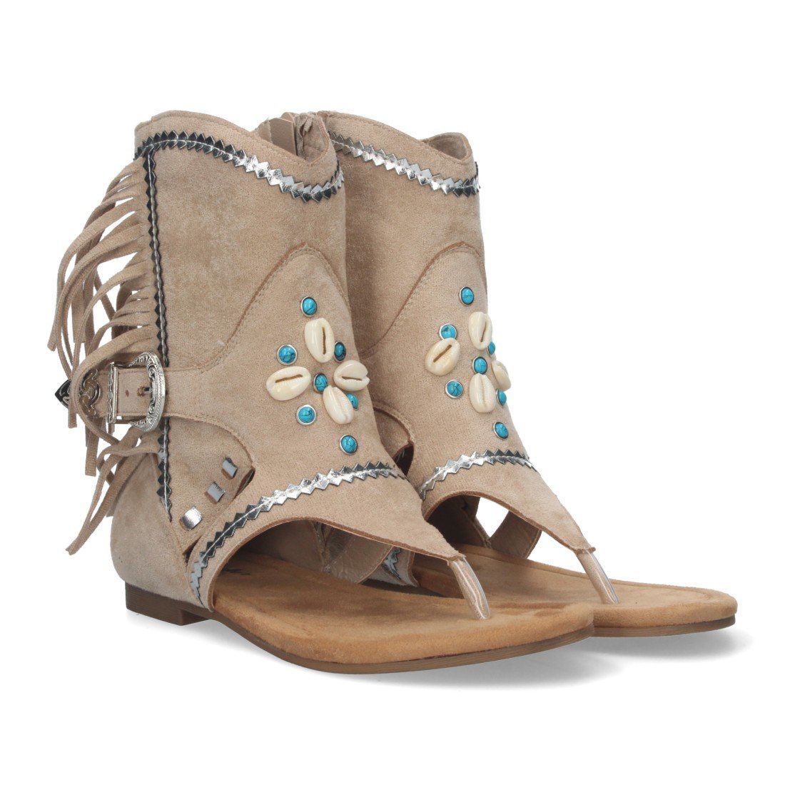 Sandalia Plana para Mujer, Tipo Esclava, con Flecos, Detalles Metálicos, Hebilla Ajustable y Adornos, Cierre de Cremallera.