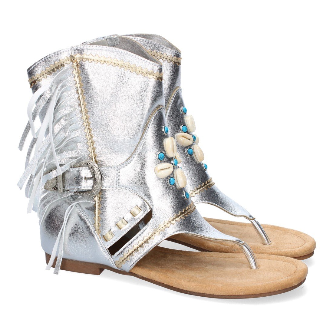 Sandalia Plana para Mujer, Tipo Esclava, con Flecos, Detalles Metálicos, Hebilla Ajustable y Adornos, Cierre de Cremallera.