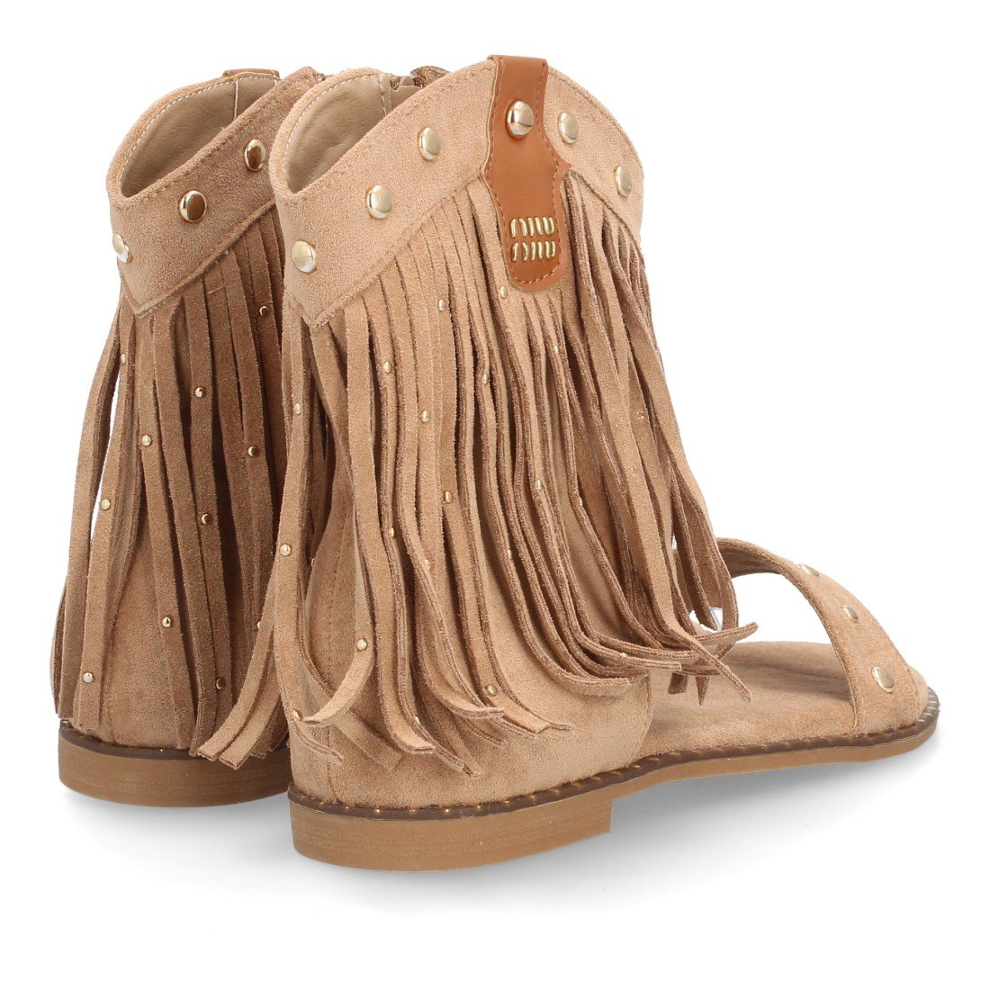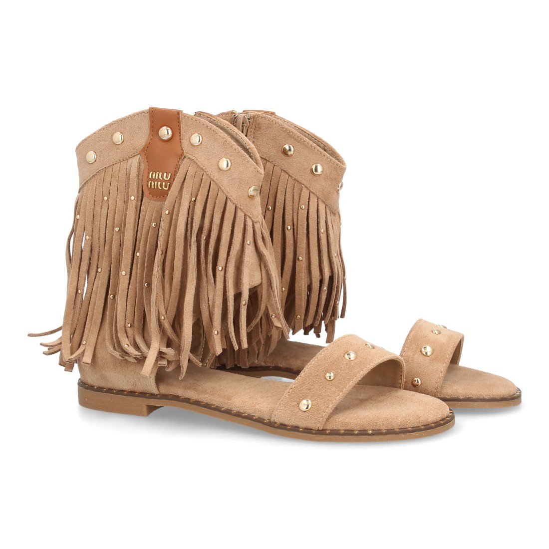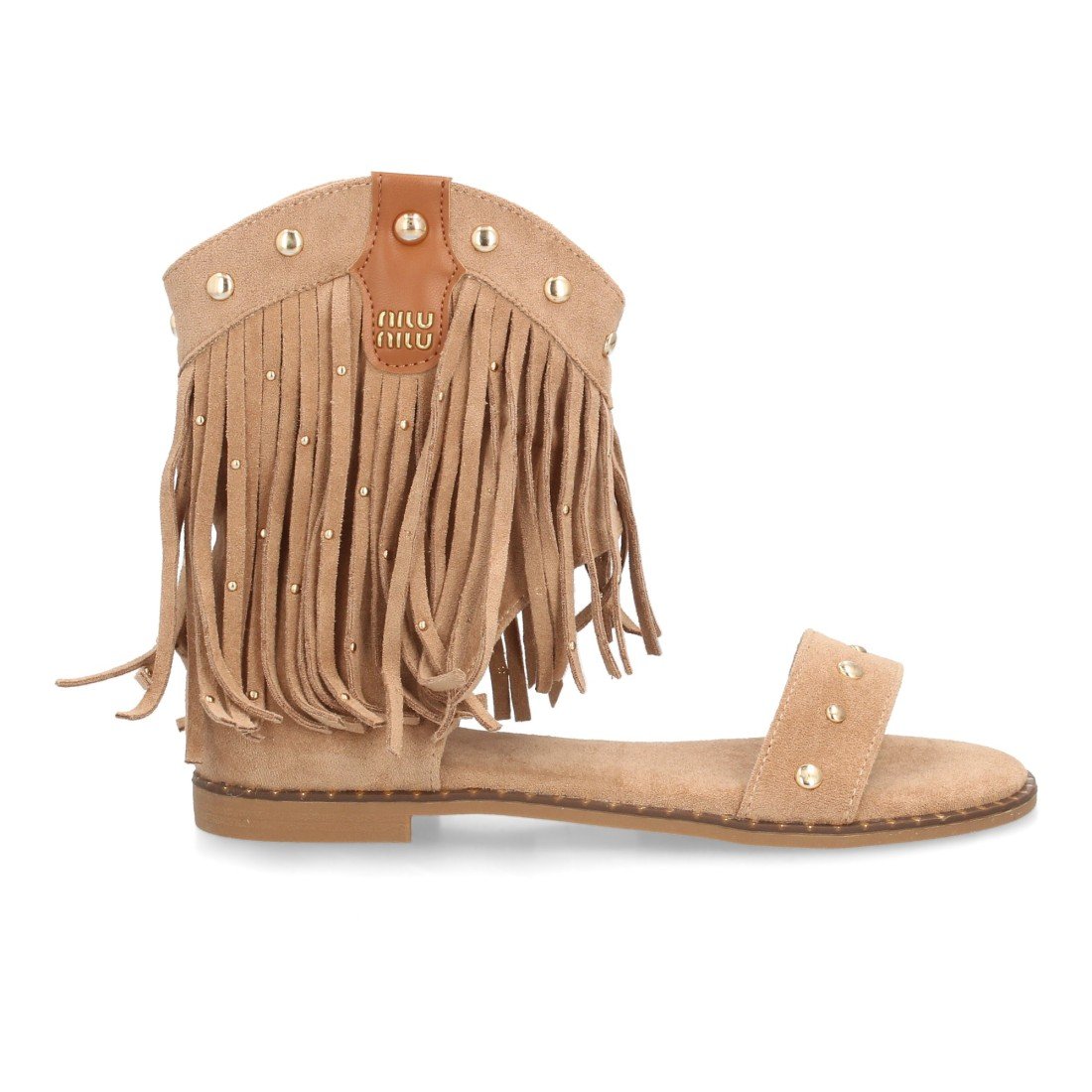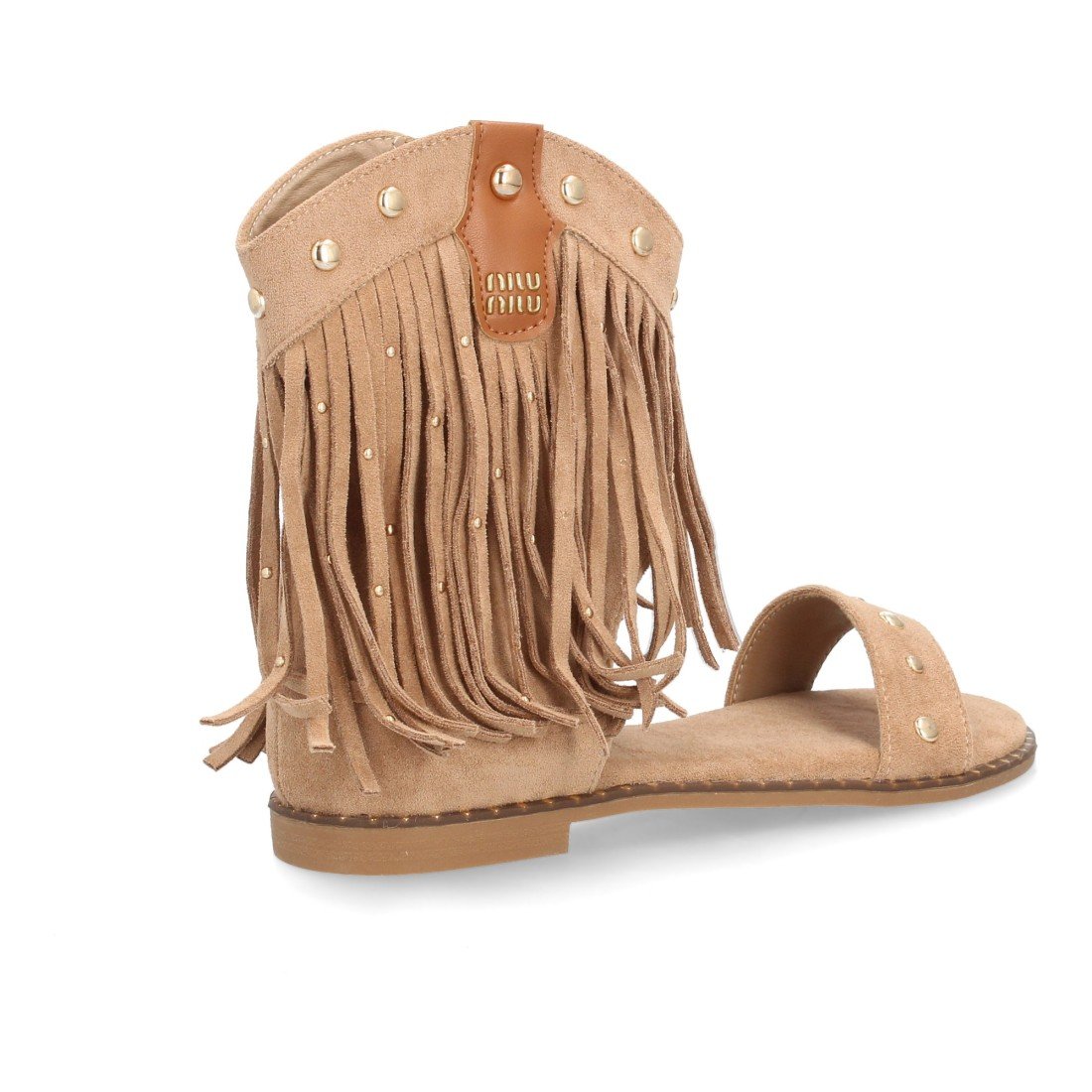 Sandalias planas boho western para mujer. Caña con flecos largos, decorada con tachuelas metálicas, tira ancha y cremallera trasera. Suela plana comoda ideal verano.