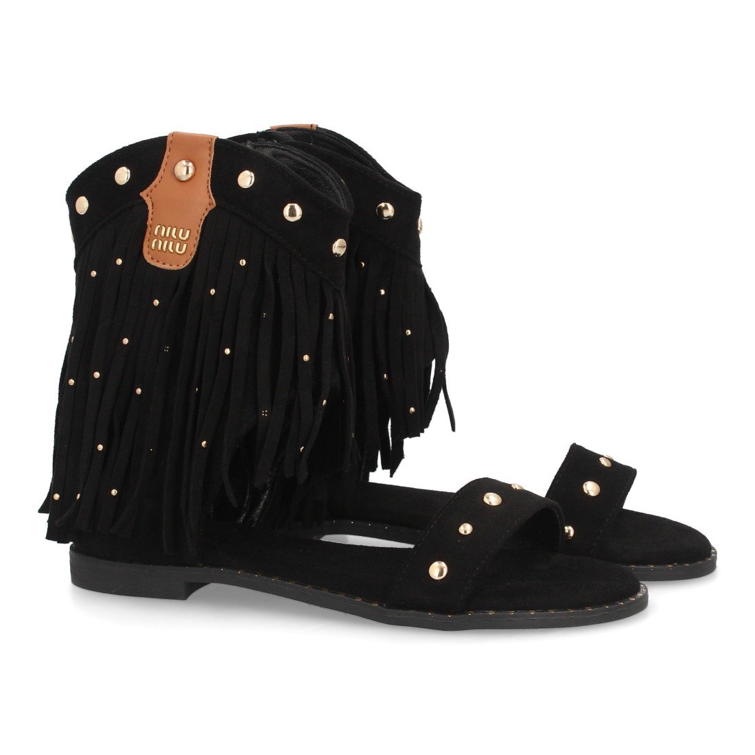 Sandalias planas boho western para mujer. Caña con flecos largos, decorada con tachuelas metálicas, tira ancha y cremallera trasera. Suela plana comoda ideal verano.