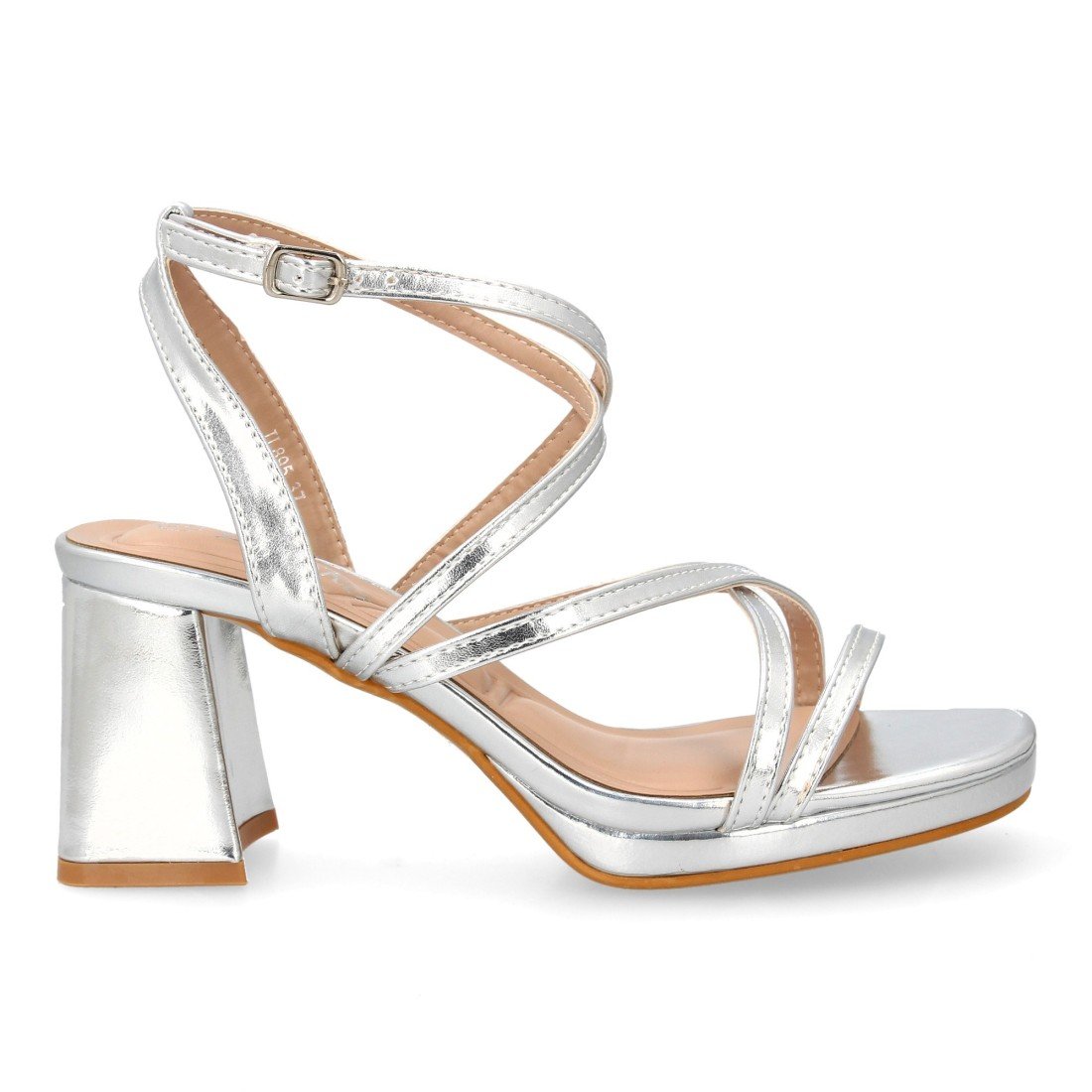 Sandalia de tacón para mujer con diseño de tiras cruzadas finas y delicadas. Tacón ancho y plataforma delantera para mayor estabilidad. ELegante para eventos con cierre de hebilla.