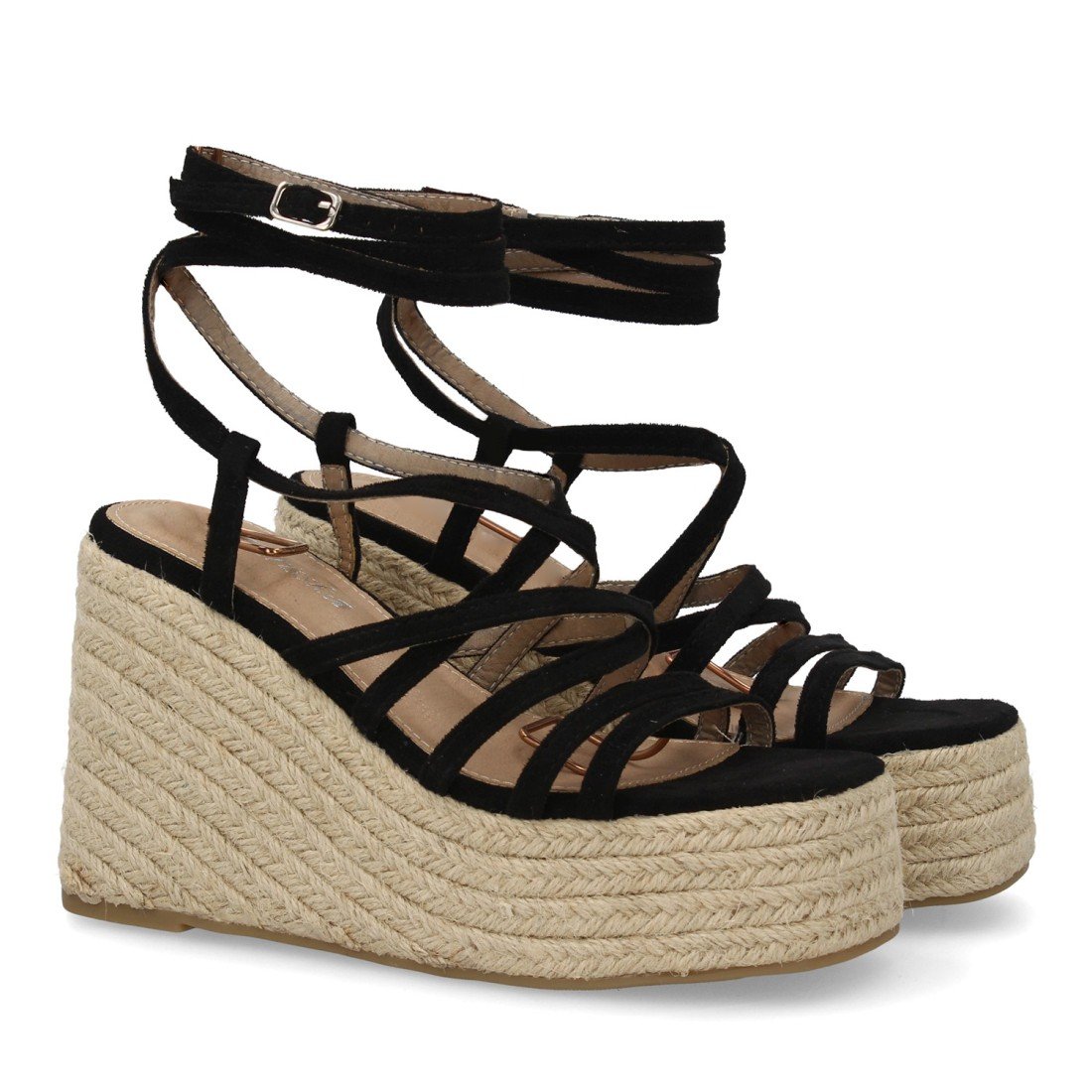 Sandalias de cuña alta estilo romano con plataforma de yute trenzado. Cierre de cuerdas. Diseño de tiras finas envuelve el pie y se ajusta al tobillo. Ideal primavera verano.