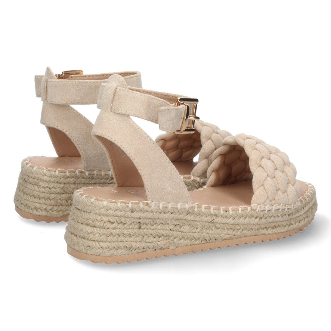 Sandalia Plana para Mujer, Comoda, Forrada de Yute, Pala Trenzada, Talon Abierto y Cierre de Hebilla en el Tobillo
