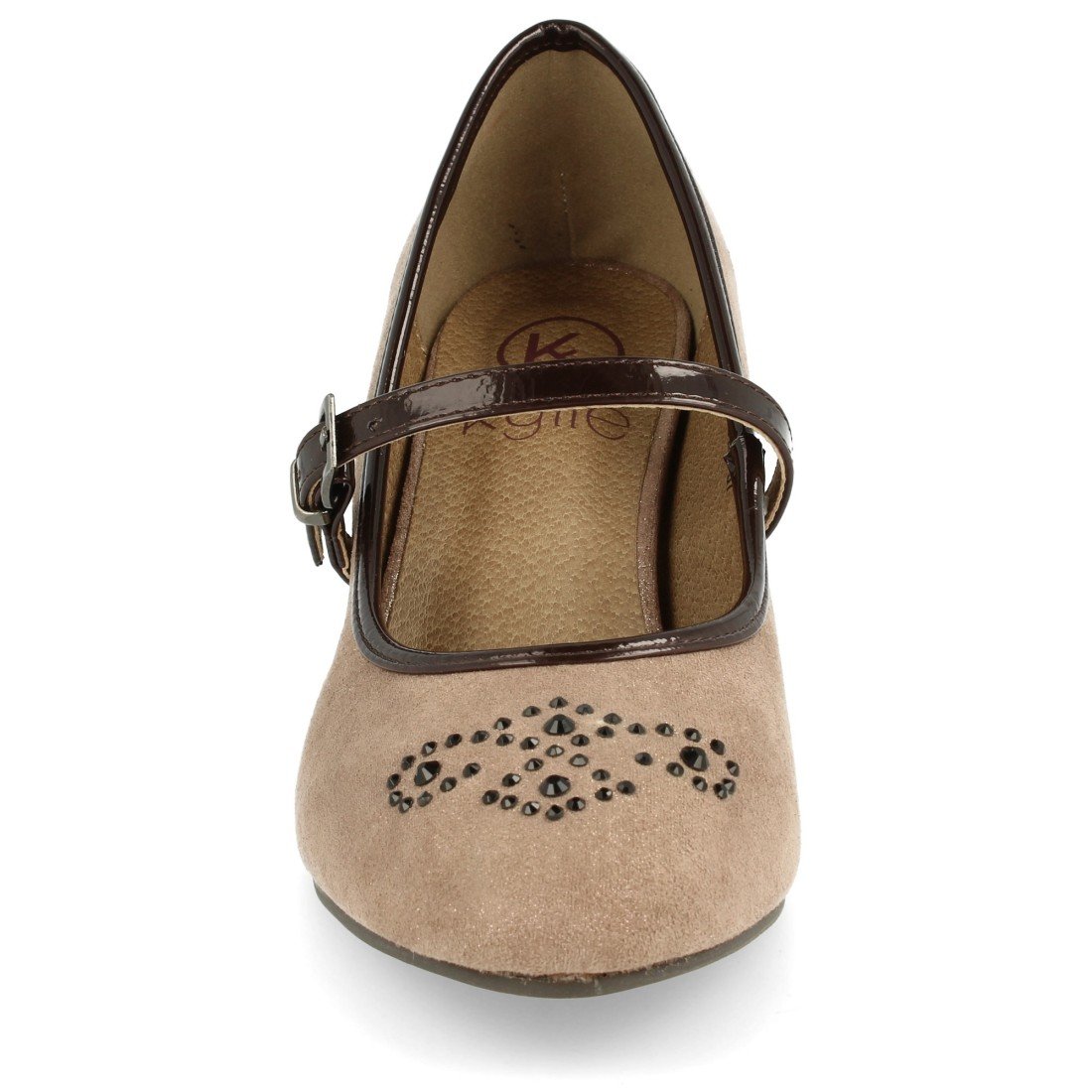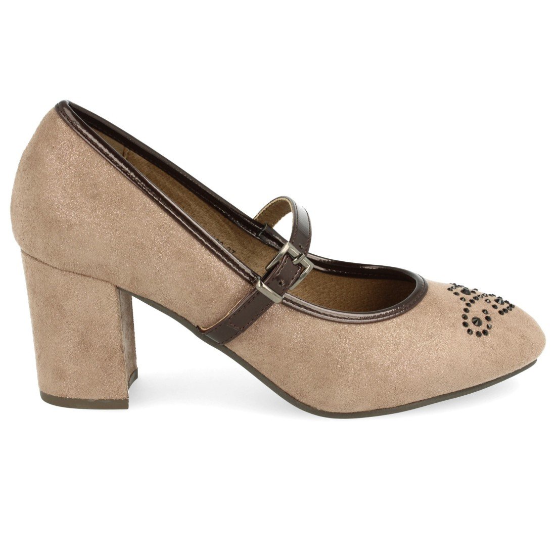 Zapato cerrado tipo mercedita, de tacón cuadrado y punta redonda, con correa con cierre de hebilla en el empeine y detalles de pedrería en la punta y el contorno del zapato en charol. Altura de tacón: 6 cm.