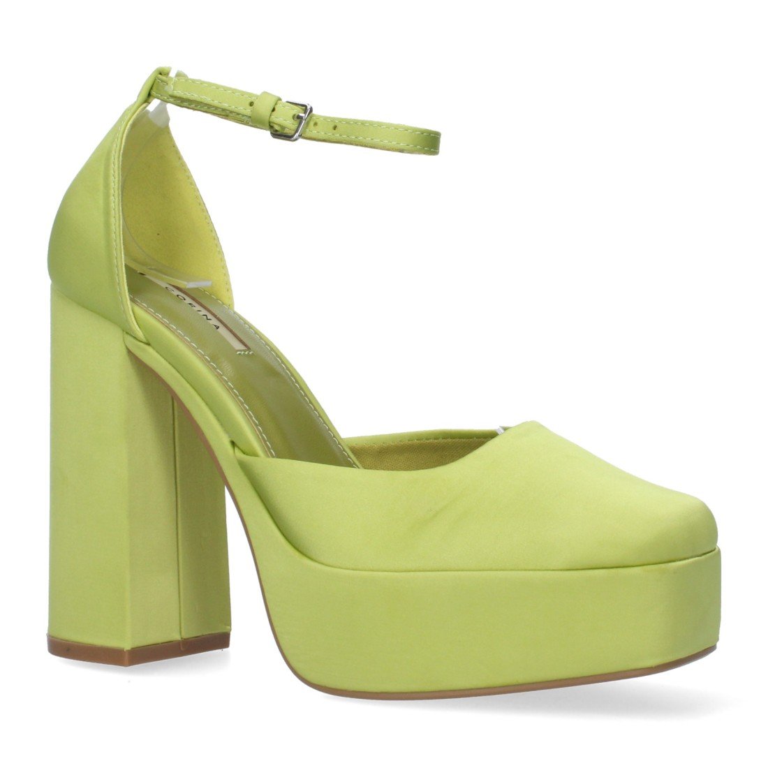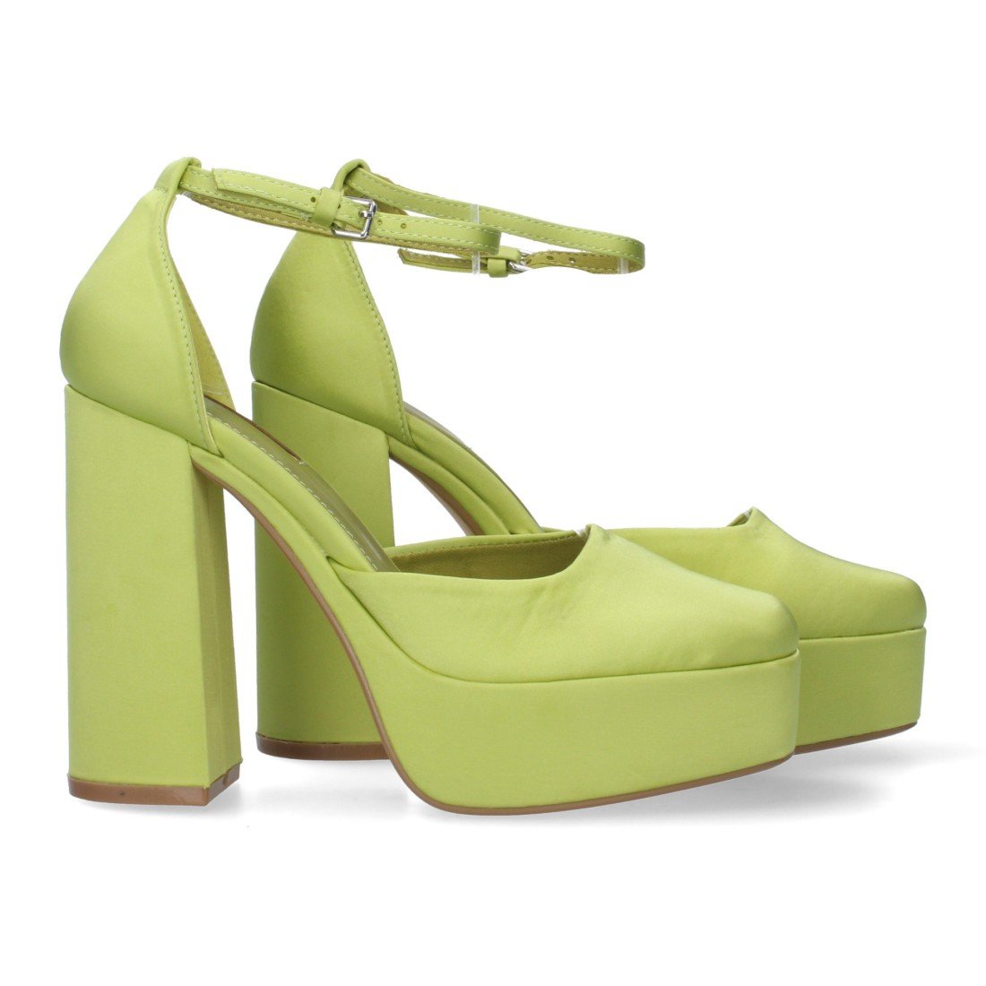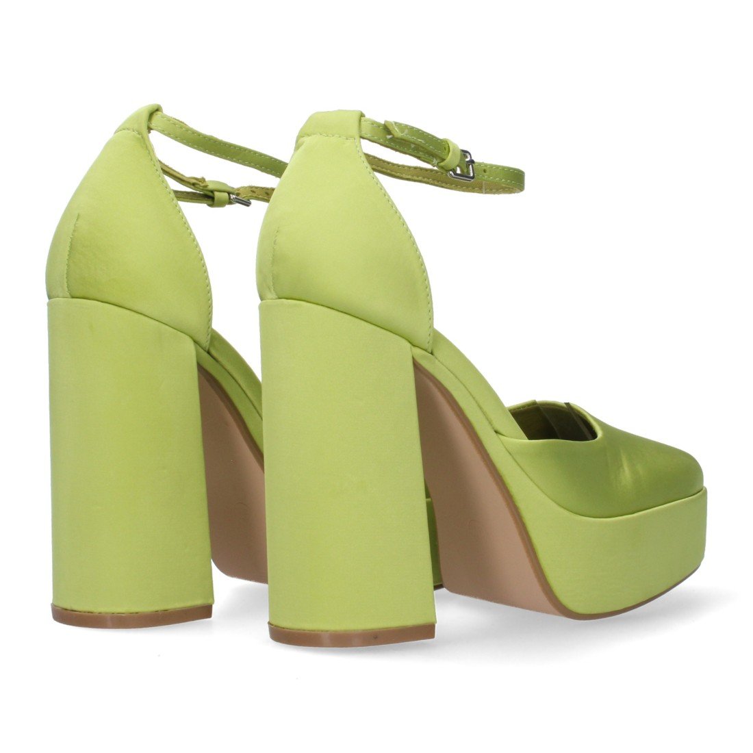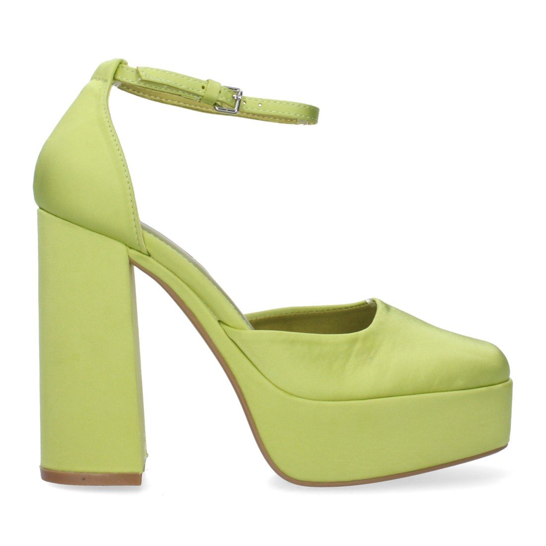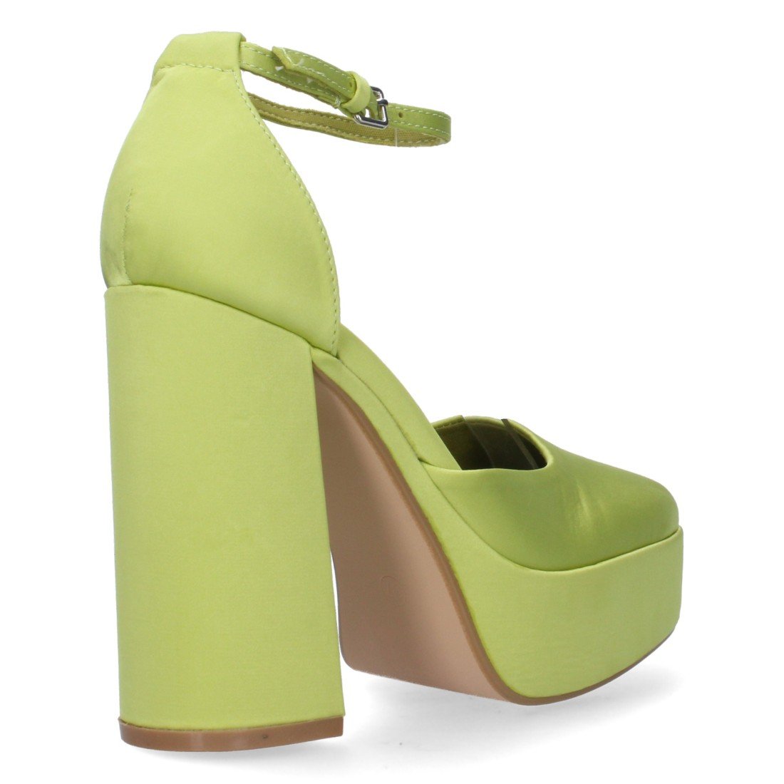 Sandalia de tacon para mujer con cierre de hebilla en el tobillo efecto raso. Tacon cerrado y empeine abierto.