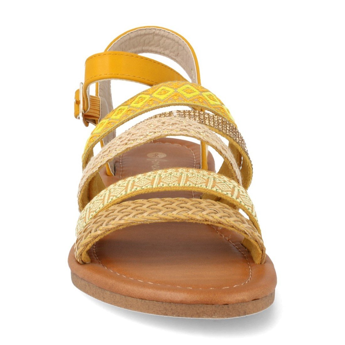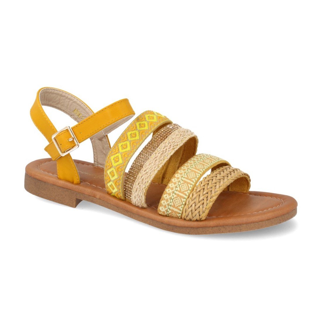Sandalia multitira con trenzados geométricos y cierre de hebilla en el tobillo.