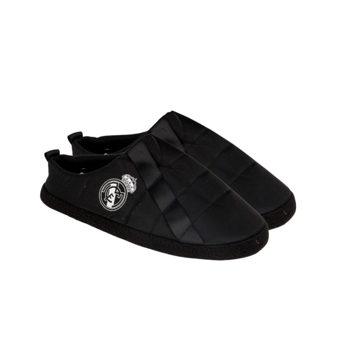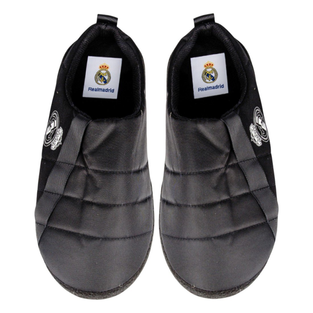 Zapatillas de estar por casa del FC Real Madrid con diseño clásico con el escudo oficial del club, fabricadas en España con materiales resistentes. Suela flexible, lavables.