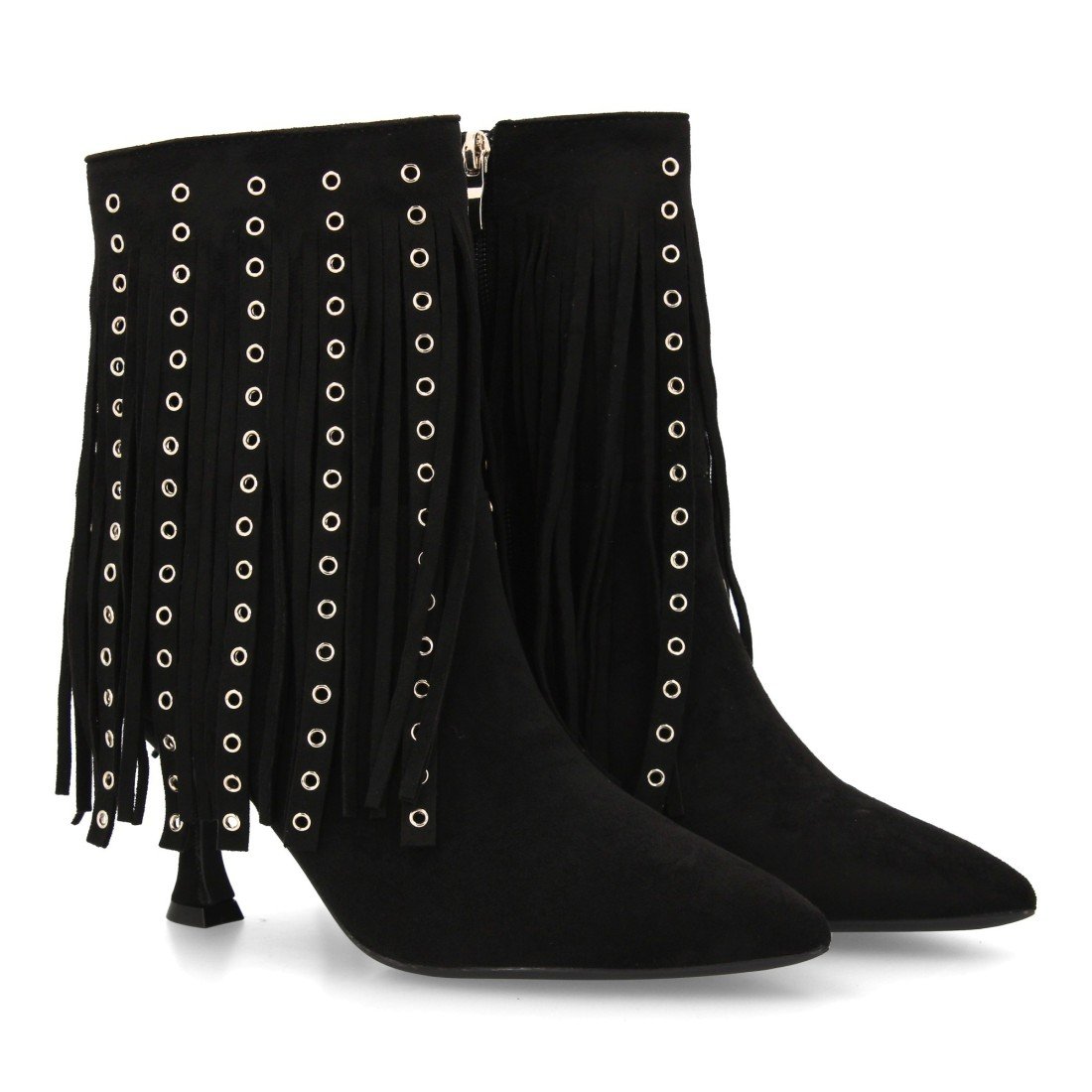 Botín de mujer con diseño de caña adornada con flecos largos y ojales metálicos. Acabado en punta y tacón fino. Cierre lateral con cremallera ideal temporada otoño invierno.