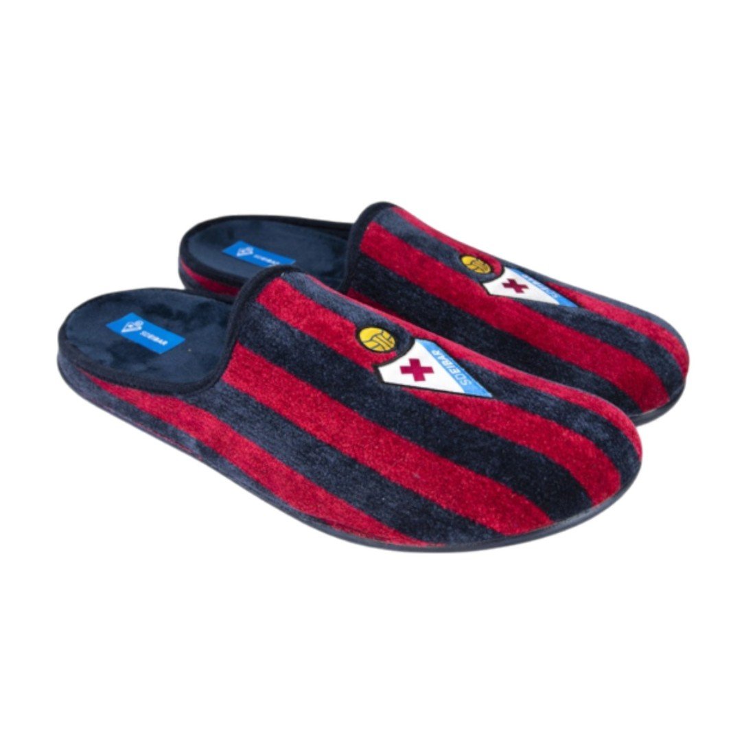 Zapatillas de estar por casa del SD Eibar con diseño clásico con el escudo oficial del club, fabricadas en España con materiales resistentes. Suela de caucho antideslizante.