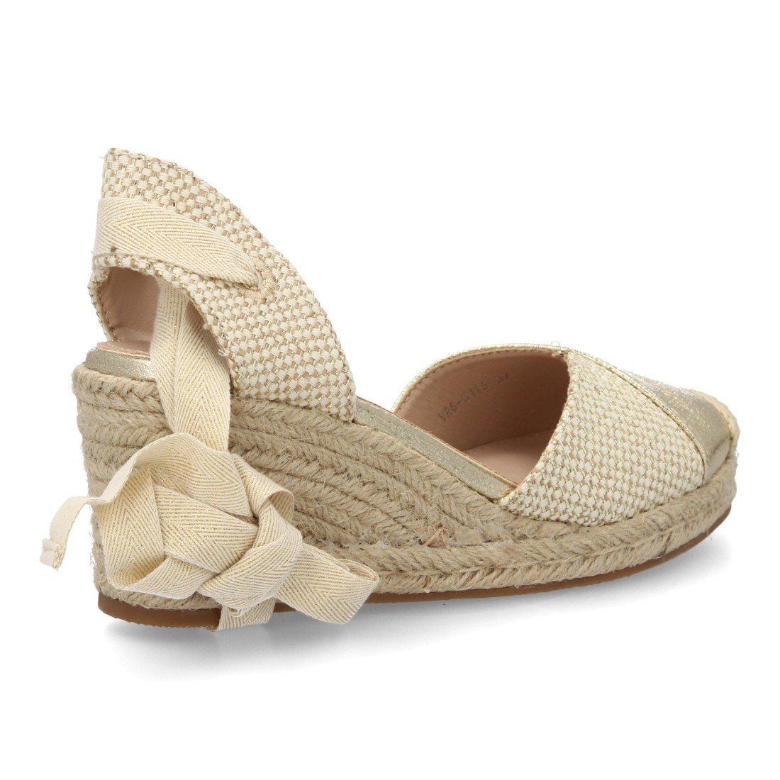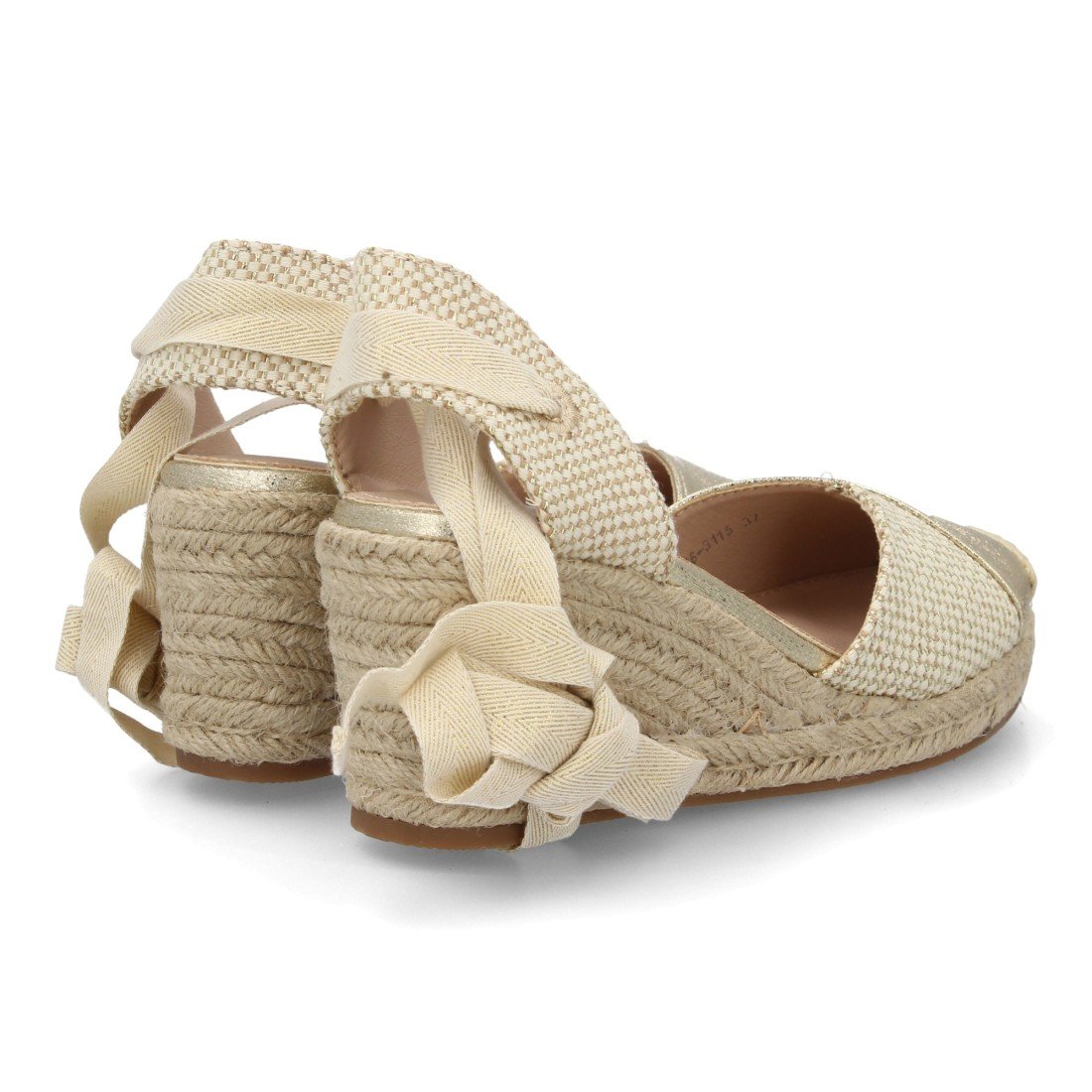 Alpargata sandalia de mujer con cuña baja de esparto para mujer, detalle de texturas. Cierre de cintas al tobillo atadas a la pierna, talon abierto, ideal primavera verano.
