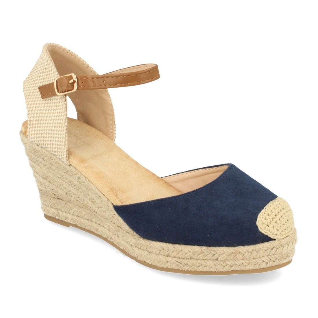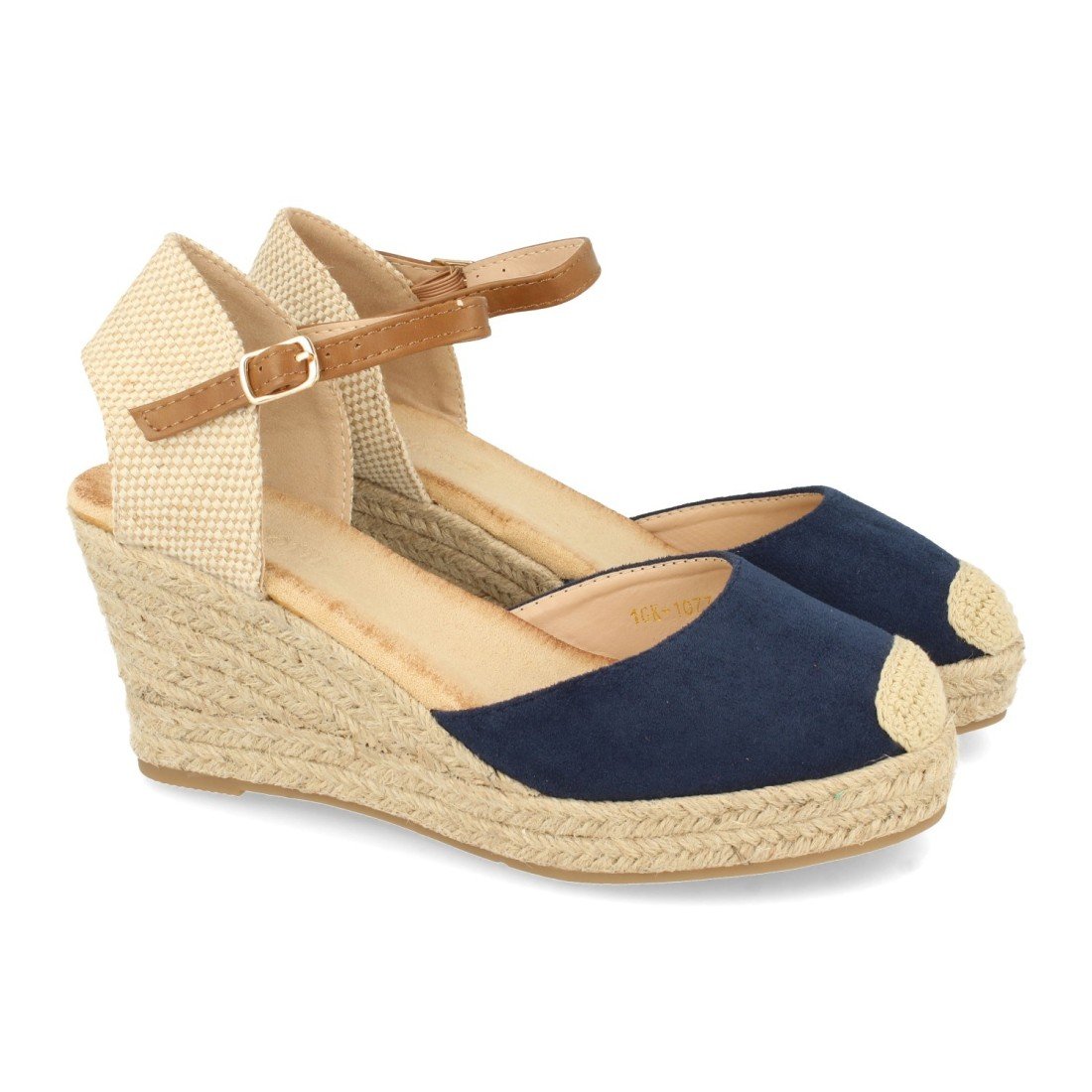 Sandalia de Cuña con Yute, Estilo Valenciana, Pala Cerrada, Talon de Rafia y Cierre de Hebilla en el Tobillo, Primavera Verano 2021