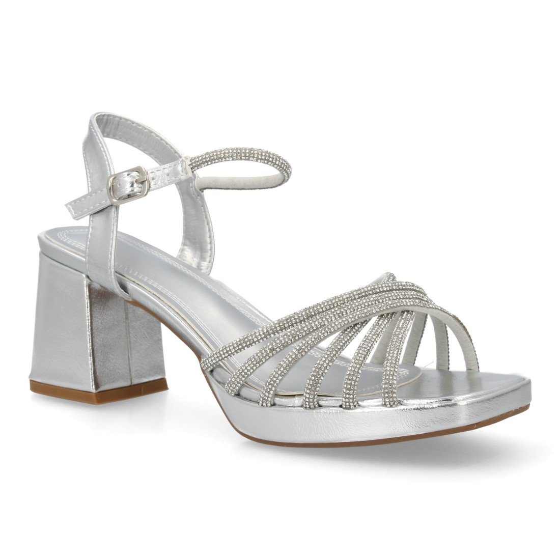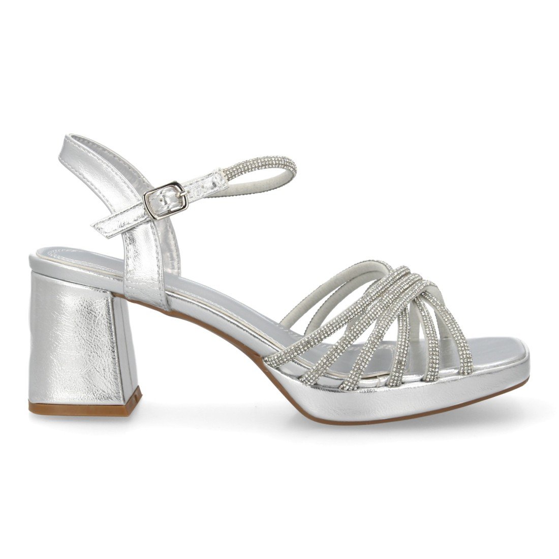 Sandalia de tacón ancho perfecta para eventos, celebraciones y ocasiones especiales. Pala de tiras finas decoradas con brillantes, cierre de hebilla, comodas para mujer.