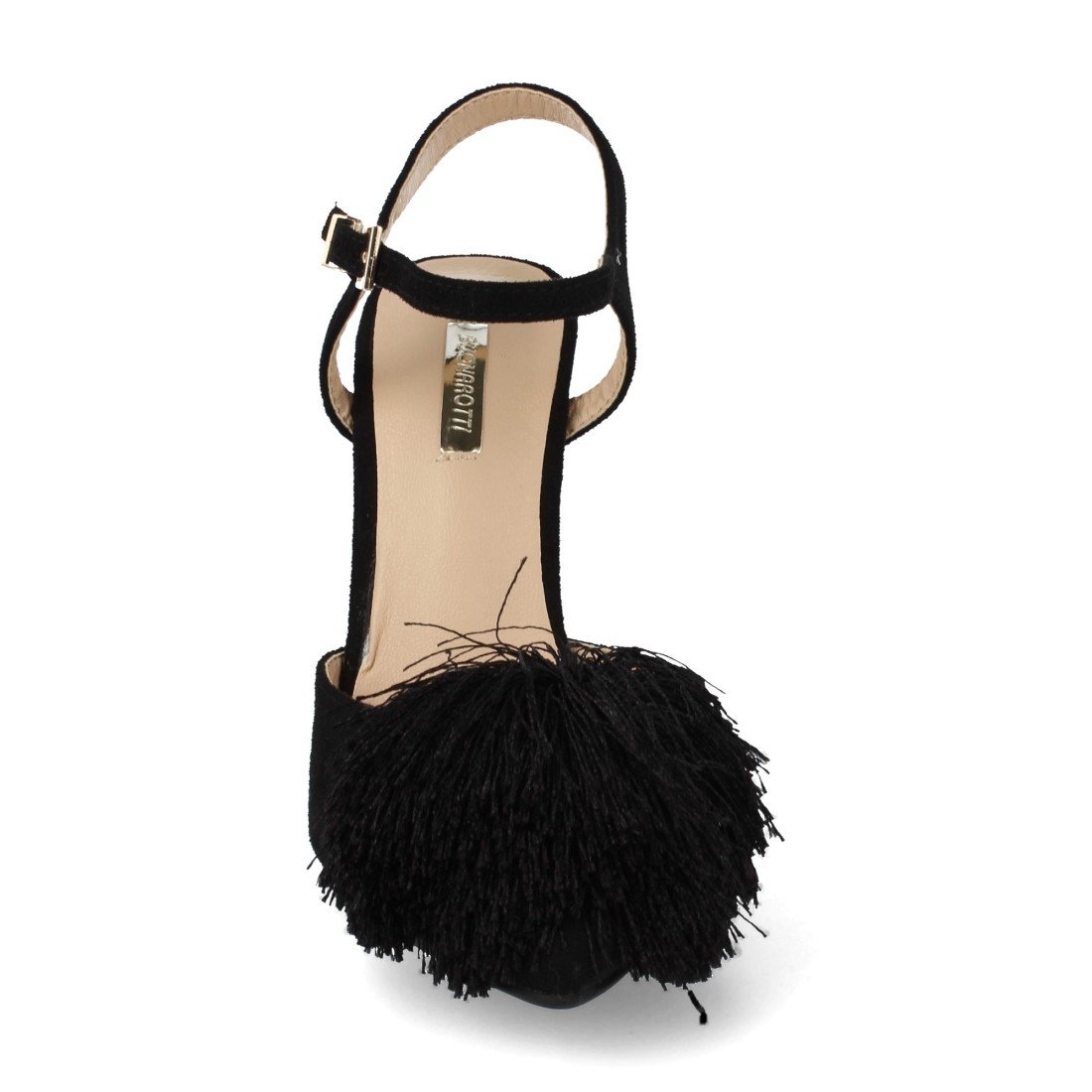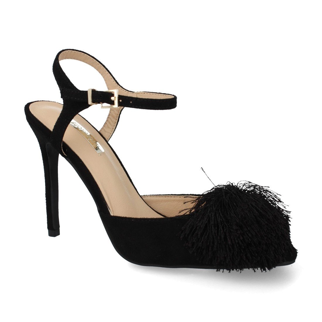 Zapato de salón destalonado con tacón y punta finos y pompón de hilo en el empeine.