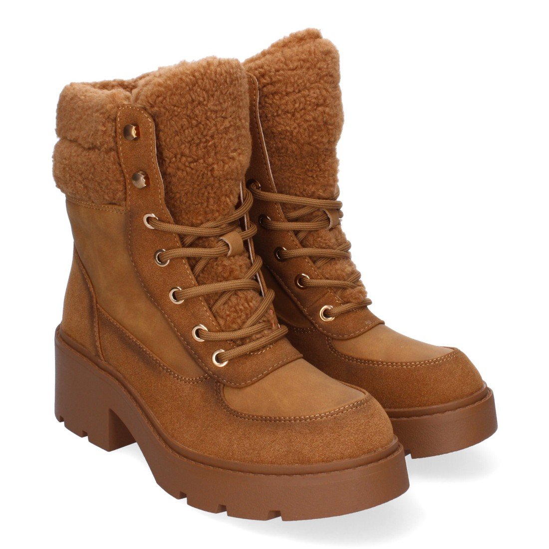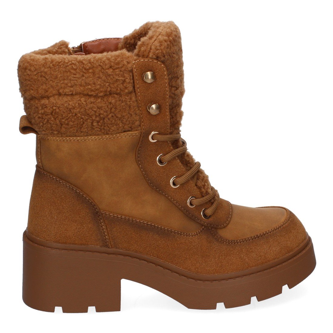 Botines de Tacón para Mujer, Comodos y Elegantes, Forrados de Borreguillo, Adornos Metálicos, Puntera Redonda y Cierre de Cordones para un ajuste cómodo y seguro.