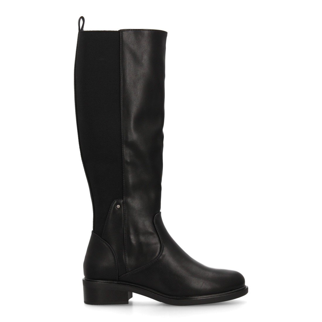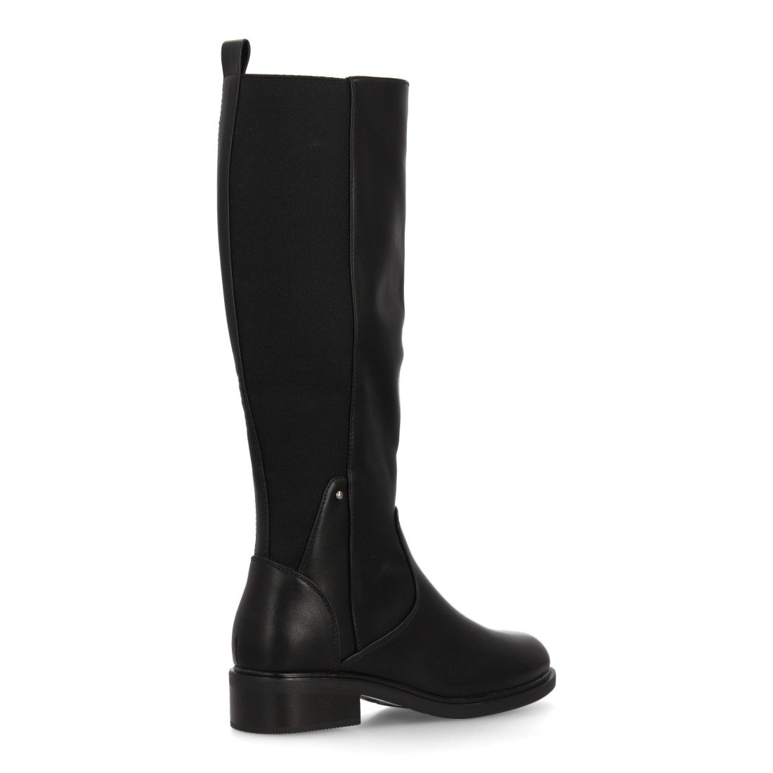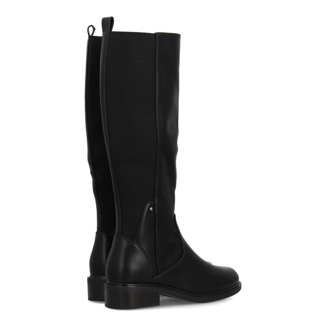 Bota alta con caña elástica en la parte trasera que se adapta perfectamente a la pierna para una mayor comodidad. Estampado liso y cierre de cremallera, suela plana con tacón bajo. Para mujer ideal temporada otoño invierno.